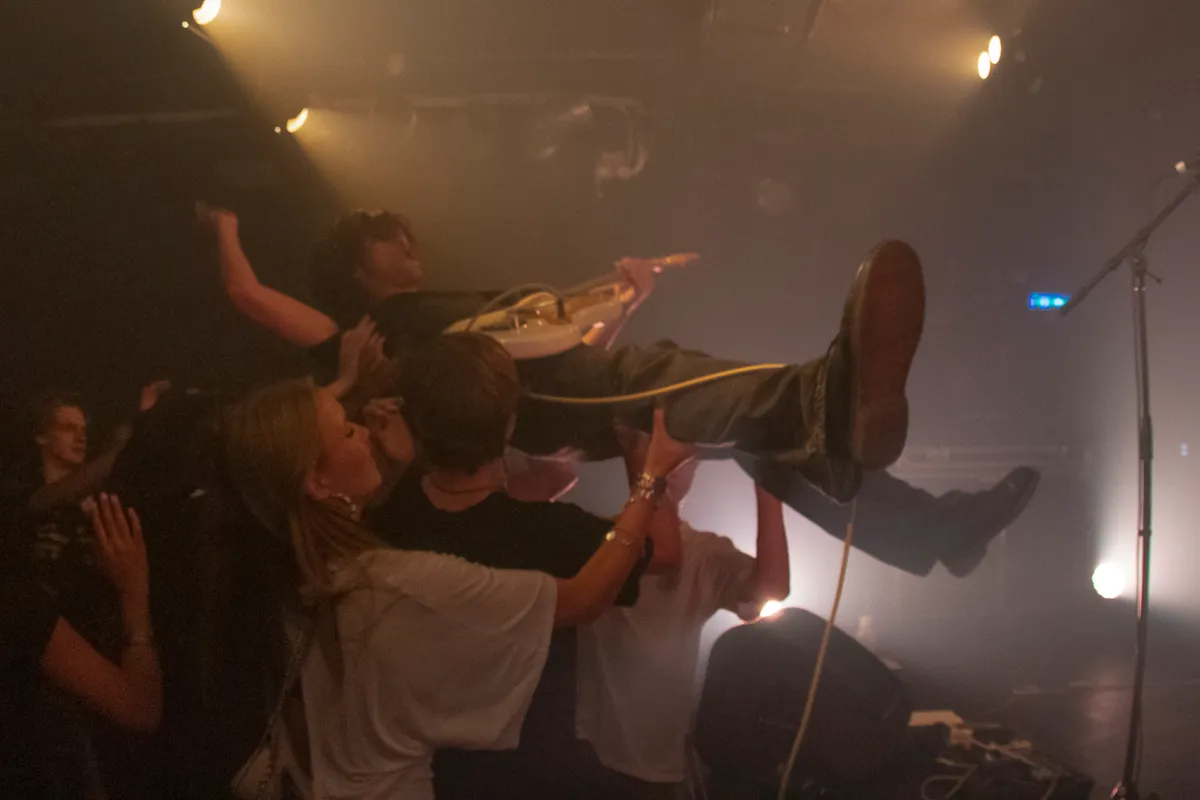 Als laatste naam van de avond komt punktrio Eyesores het podium op. De zaal lijkt wel wat leger dan net; wellicht hebben de strijders die morgenvroeg weer aan de bak moeten na Nomads Radio al afgehaakt. Een stomme zet, want die mensen missen de nucleaire bom aan energie die deze donderdag afsluit. Alsof de Dead Kennedys naar Ty Segall hebben geluisterd en de problemen van 2025 aan de kaak stellen. Dit blijkt bijvoorbeeld uit de single ‘Fragile’ die dezelfde avond uitkomt, waarin kwetsbare toxische mannetjes op de hak worden genomen. Een populair en belangrijk thema, getuige het recent uitgekomen ‘BANGE MANNEN’ van de Amsterdammers van Hang Youth, die de volgende dag Burgerweeshuis platspelen. De moshpit die bij het vorige optreden al was begonnen breidt zich tijdens Eyesores alleen nog maar uit totdat er voorin de zaal geen ontsnappen meer is aan een uitsgeschoten schedel of elleboog in je rug. Gitarist en zanger Justin Ruitenschild en bassist Lars van den Bogaard zijn helemaal in sync en drummer Jochem Lambert schroomt er niet voor om tijdens breaks achter zijn trommels op en neer te stuiteren. De band uit Harderwijk (‘Hardstewijk!’) raast in een moordend tempo maar geenszins overhaast door hun set heen en bespeelt het publiek net zo goed als hun instrumenten. Tijdens afsluiter ‘Road Rage’ lukt het Justin warempel om in de halflege zaal een crowdsurfactie in gang te zetten. Eyesores is een punkmachine waar je binnenkort waarschijnlijk niet meer omheen kan. De band laat het publiek dolblij achter en met een paar welkome blauwe plekken.