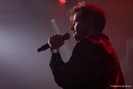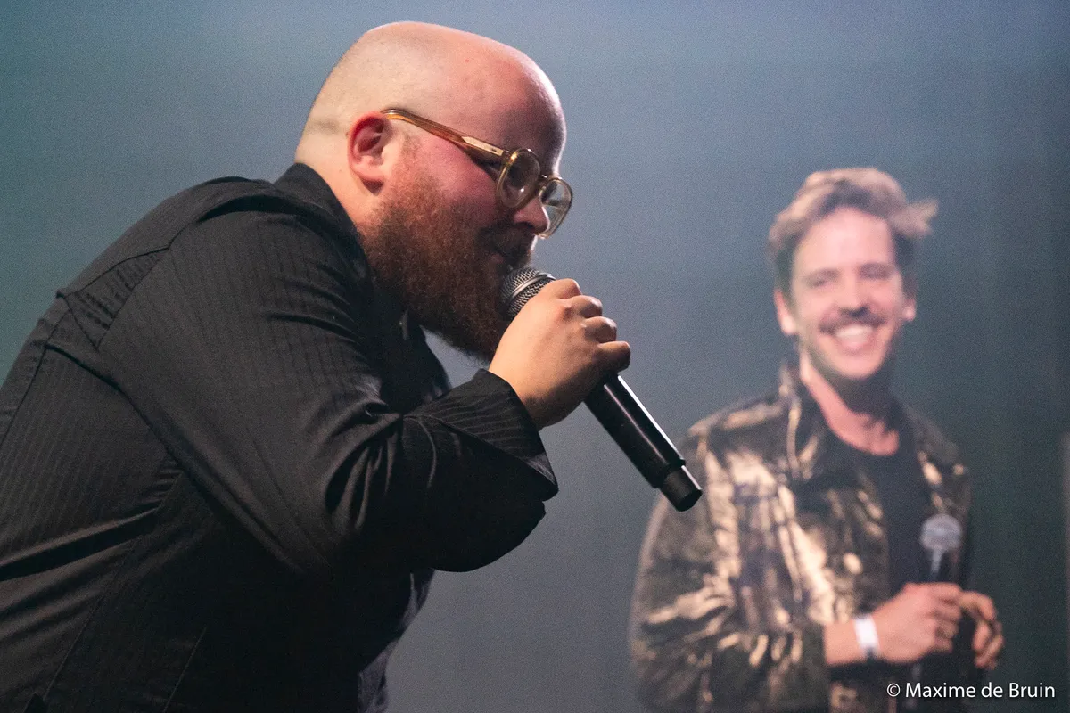 Het tegendeel blijkt waar. Met een overstap naar ‘De Populist’ van de gelijknamige debuut-EP uit 2021 als tweede nummer knalt de energie van het podium de zaal in. Openhaart (ook bekend van I Am Lotus) jut iedereen met aanstekelijke energie op in een gecombineerde rol als multi-instrumentalist, danser, tweede stem, MC en hype-man. “Oh, en hij is ook kok”, vertelt IMBOS wanneer hij zijn live-band voorstelt. Aangevuld met heen en weer gezang met de drie zangeressen, een knallende lichtshow en gespeeld-narcistische gebaartjes tijdens “stemmen op mij” zet de goed gesnorde singer-songwriter een krachtige act neer.