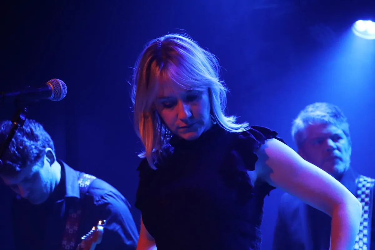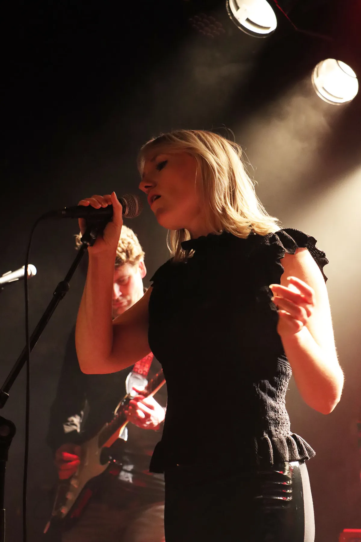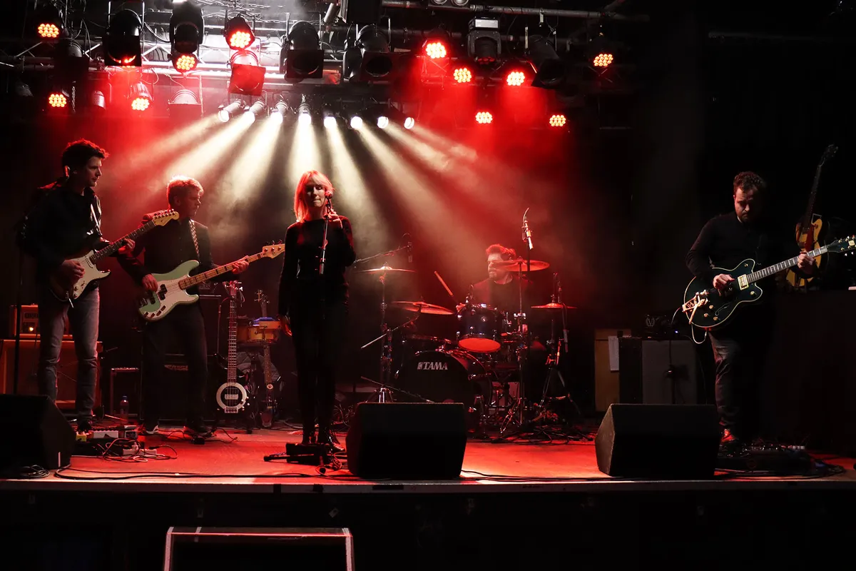 Acht nummers brengen ze ten gehore en na een aanvankelijk voorzichtig begin komen de bandleden al snel in het vuur van het spel. Wat vooral opvalt zijn de zuivere stem van Dagmar en het virtuoze gitaarspel van Jaap. Dit wordt aangevuld met de gitaar en zang van Ruud en het geheel wordt mooi gedragen door de ritmische ondersteuning van de beide Rutgers op bas en drums. Het licht is ‘op zijn Merleyns’, waardoor de helft van de show zich grotendeels in het duister afspeelt, maar aan de sfeer doet dat niets af. Hooguit zijn de foto’s er wat gruiziger van geworden.