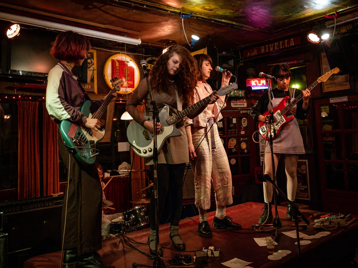 Het is al gezellig druk in het Pakhuis als Wholly Michael gaat spelen. De vier jongemannen stonden brachten in 2018 hun eerste EP uit, stonden vorig jaar in de Popronde en vermengen vanavond onder een draaiende discobal hun strakke krautrock met psych. Kort daarvoor werd de toko flink verbouwd door de mannen en vrouwen van Het Kanaal.