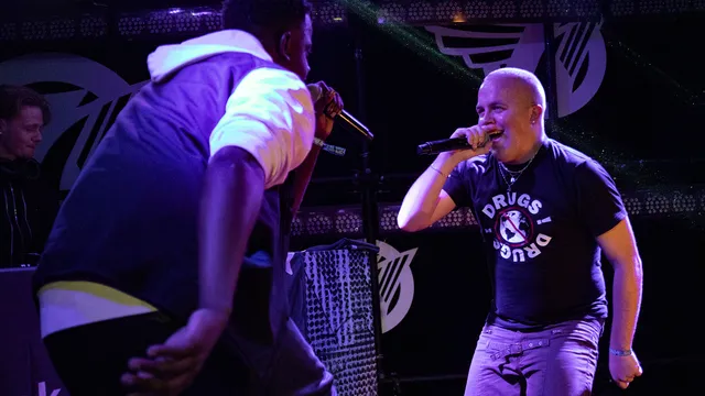De hype is voelbaar vanaf moment één bij het optreden van Brunzyn in de kelder van de Oosterpoort. De rapper uit Vlaardingen komt hier om te vertellen dat hij klaar is om overal in Nederland op te treden, ook in Groningen. “We gaan van drie, naar twee, naar drie, twee, een!”, zo weet Brunzyn zijn piepjonge publiek steeds weer op te zwepen. Het zijn vooral gastjes in bodywarmers en snelle zonnebrillen die hier staan en het heel hard vinden. Ongetwijfeld gaan zij later nog Joost en Gotu Jim checken, die net zo cult zijn als de peroxideblonde Vlaardinger.