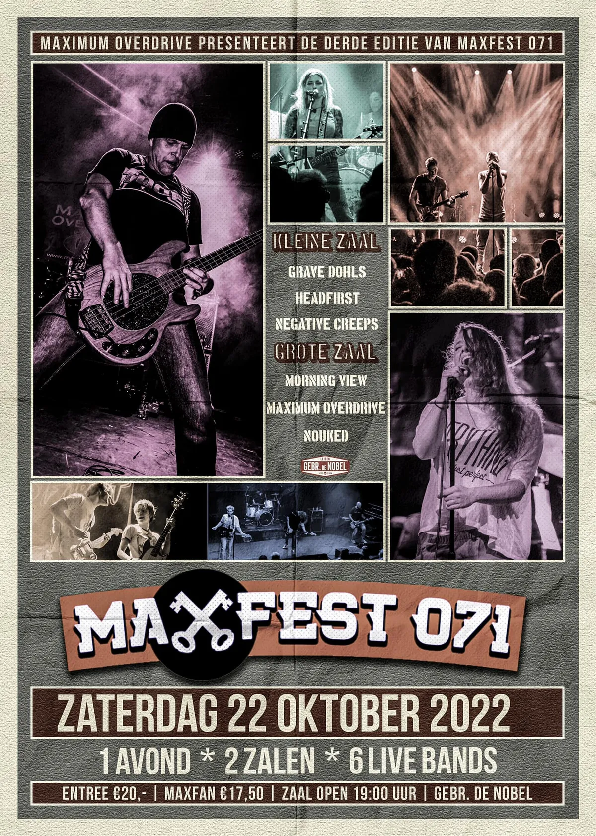 Maxfest071 mag op de monumentenlijst. De derde editie, gehouden op 22 oktober 2022 in Gebr. de Nobel, is wederom een succes, cultureel en sociaal gezien. Extra bijzonder wordt het omdat gastheren Maximum Overdrive er hun vaarwel vieren: na dertig jaar rrrock ‘n’ rrrollen wordt dit hun laatste ‘kunstje’. Alleen daarom al moeten fotograaf Fraukje Vonk en gelegenheidsverslaggever Ruben Verheul naar dit stuk Leids cultureel erfgoed. Maar zij zien, horen en voelen nog veel meer mooie blijken van nostalgie. En passant breken zij een lans voor het voortzetten van de traditie. Enter the comfort zone...