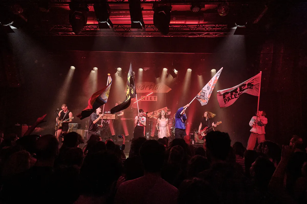 De kritische volksband houdt de aandacht van het publiek stevig vast. Bij de relevante hit ‘’Tweede Kamer’’ missen ze Goldband maar de toetsenist weet dit goed op te vangen met zijn bijzonder goede zangstem. Maar het hoogtepunt moet nog komen. Sophie sleept zo vier mensen uit het publiek het podium op, die prompt worden omgedoopt tot vlaggendragers. Vlaggen met: ’Free Palestine’, ‘Refugees Welcome’, ‘Kraken gaat door’ en een regenboogvlag wapperen heen en weer. Duidelijke statements die ze als protest stem trots laat horen en zien.