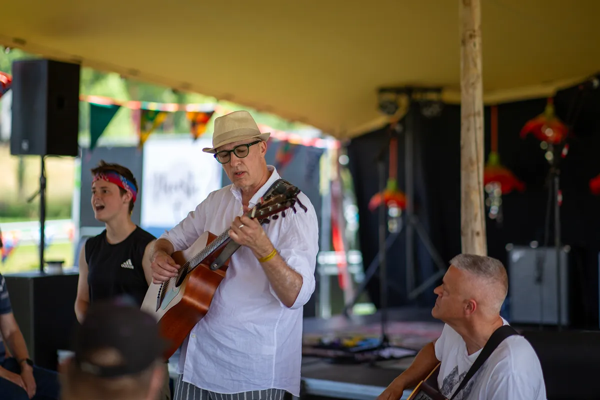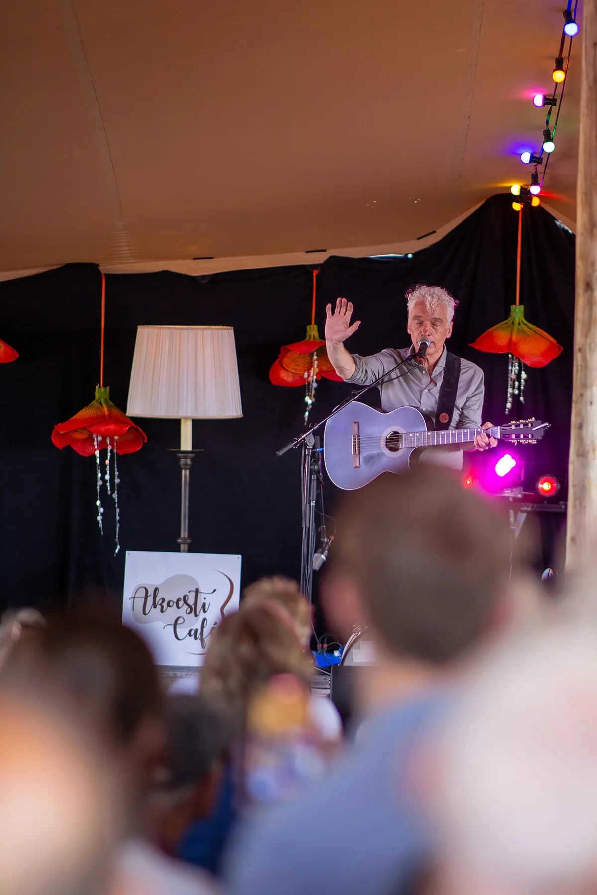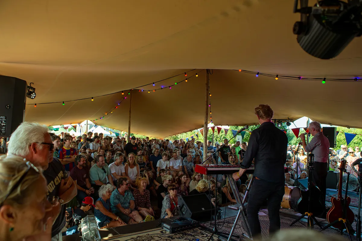 Tegen het eind van de middag speelt Spinvis - echte naam Erik de Jong - een akoestische set samen met pianist Lucas Oldeman. “Heel leuk”, noemt hij het optreden in zijn eigen woonplaats. “Het is belangrijk dat iedereen zijn eigen gemeenschap bedient. Alles draait op vrijwilligers. Er gebeuren zoveel grote dingen in de wereld. Kleinschaligheid kan ons redden.” Ook De Jong valt het jeugdige publiek op. “Het is echt een godswonder”, zegt hij zichtbaar geamuseerd. “Ik denk dat het door sociale media komt. Het is buiten ons om. Ik vind het wel heel leuk dat er mensen van veertien jaar zijn die mijn vage en oude nummers kennen. Ongelooflijk.”