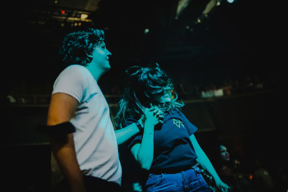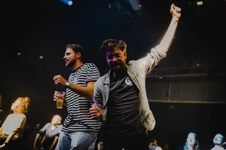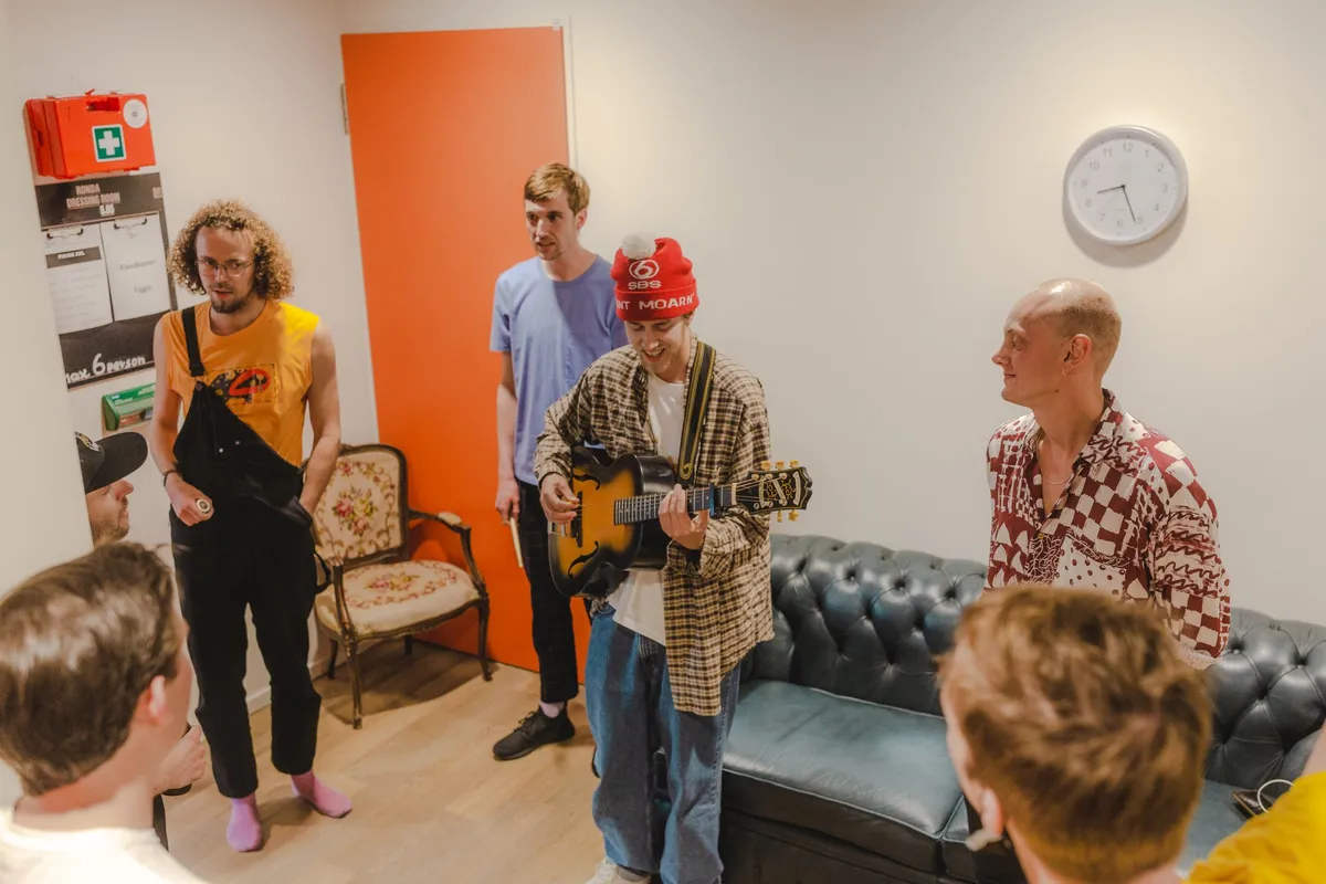 Ook met vier nieuwe spelers in hun midden is het duidelijk dat de jongens het gezellig met elkaar hebben. Er wordt gemediteerd, als wilde honden op elkaar gesprongen, getafelvoetbald en tegen schuine verstevigingsbalken op geklommen. Maar dat deze band elkaar buitengewoon goed aanvoelt, blijkt pas echt als Paul vlak voor aanvang van de show op een akoestische gitaar het intro van ‘Project 5’ inzet. Na het eerste refrein valt iedereen bij en ontstaat er een indianencirkel aan dansende, klappende en zingende muzikanten op de gang tussen de kleedkamers. Na een joelend applaus voor zichzelf is het dan eindelijk tijd om het podium op te gaan, waar Figgie met nog meer gejubel ontvangen wordt door een uitverkochte Ronda.