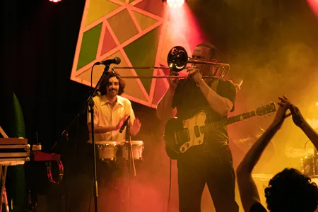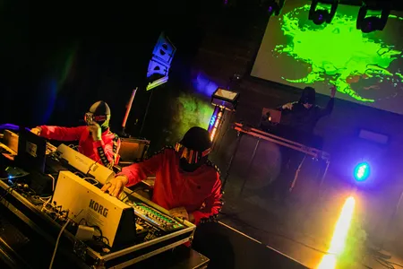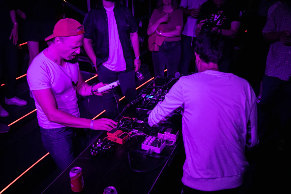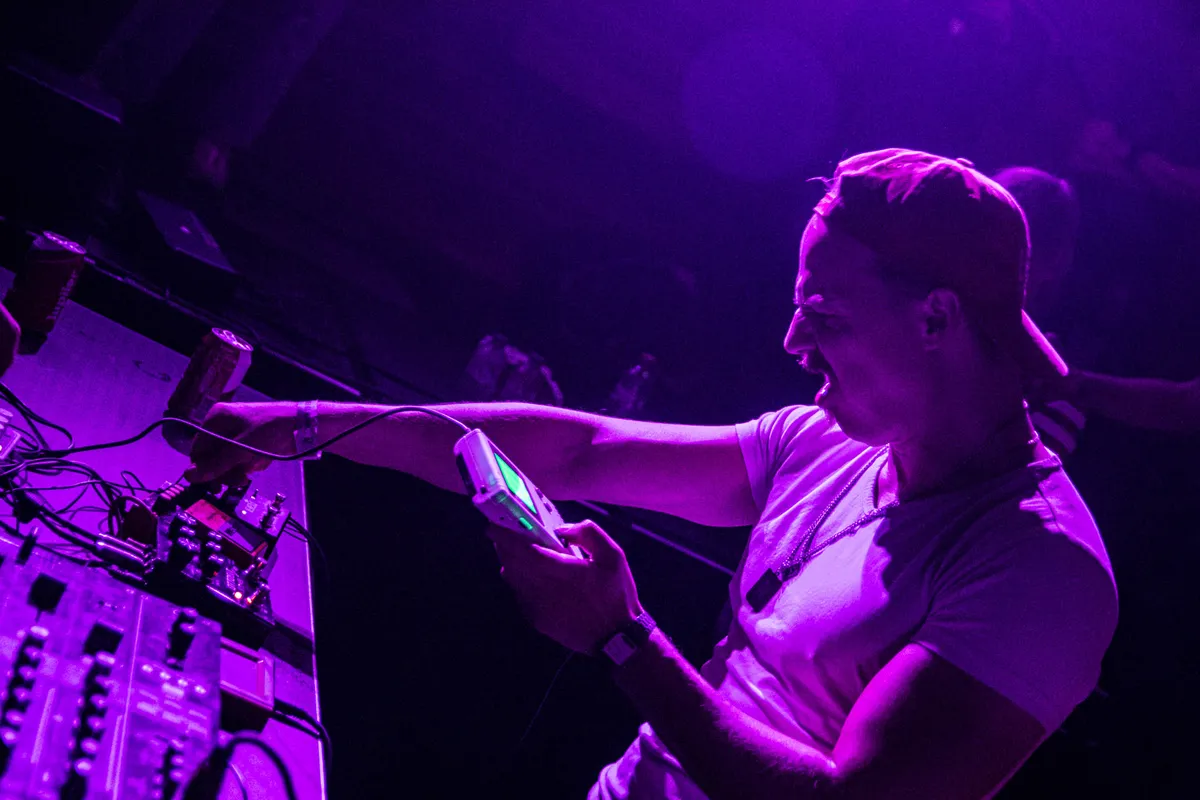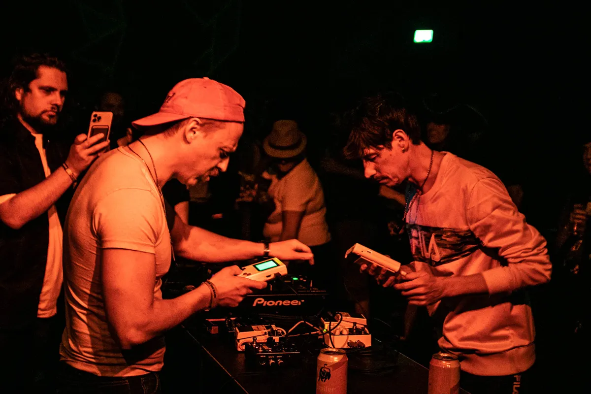 Gameboyz II Men is letterlijk twee mannen die met Gameboys muziek live maken. Tuurlijk, de apparaten zijn aangepast en de twee jagen de sound door allerlei pedalenkasten en mixdecks heen, maar het begint als, en blijft, 8-bit dansgeweld. Heel relaxt, met Micha Volders als mc en Dijf Sanders als voornaamste beatbakker, twee blikjes Jupiler op een tafel tussen het publiek. Krakend, beukend en extreem catchy. “What does this button do?” was nog nooit zo leuk.