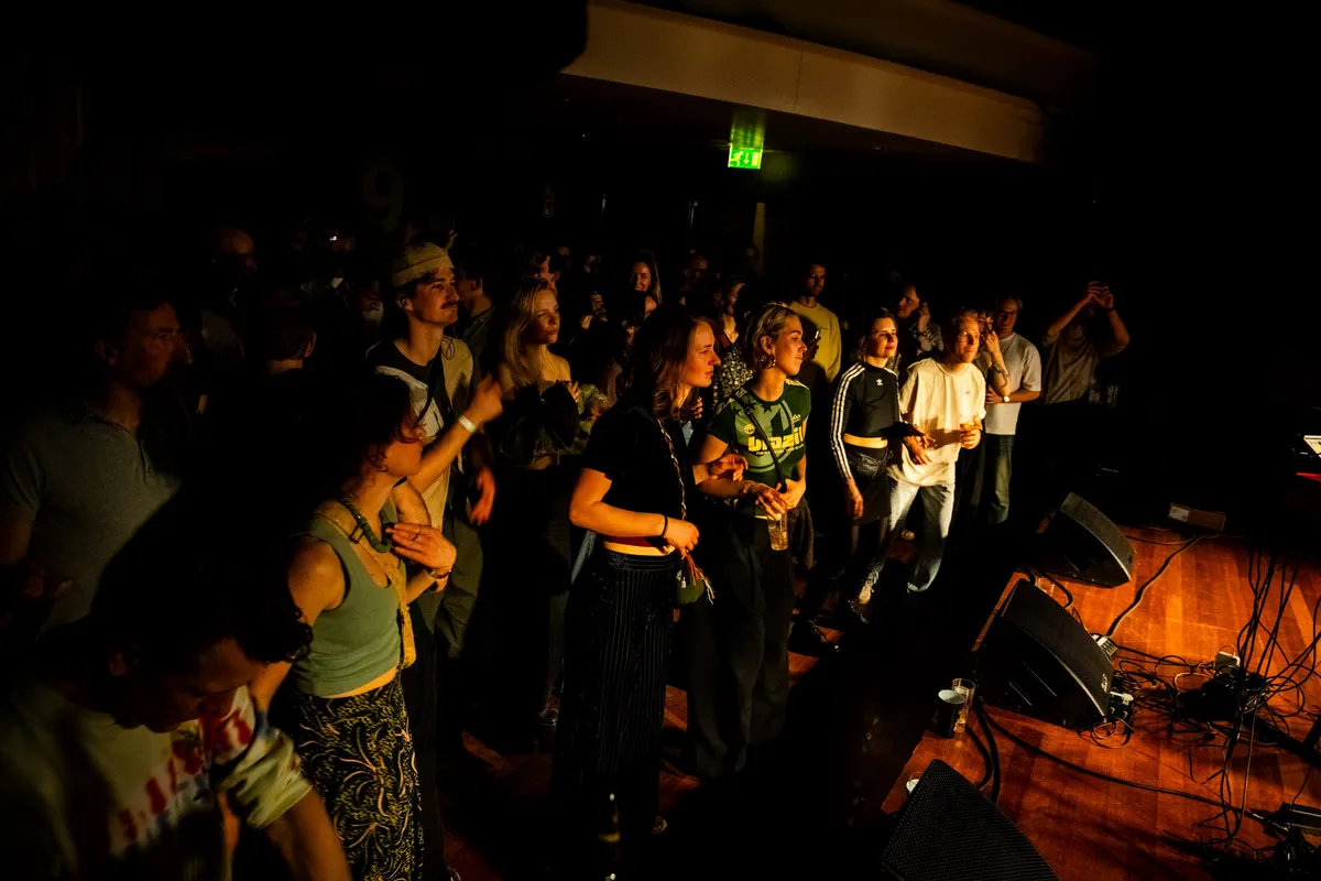 De menigte is net zo divers als de line-up: lange millennialmannen met muts, hippe Gen Z’ers in zorgvuldig uitgekozen outfits, stelletjes, ouders met twintigers. Niet verrassend dat de avond uitverkocht is. Op Ticketswap gingen ruim tweehonderd tweedehandskaartjes als warme broodjes de deur uit. De belofte van vanavond: een kleurrijke remedie tegen de laatste restjes winterblues.