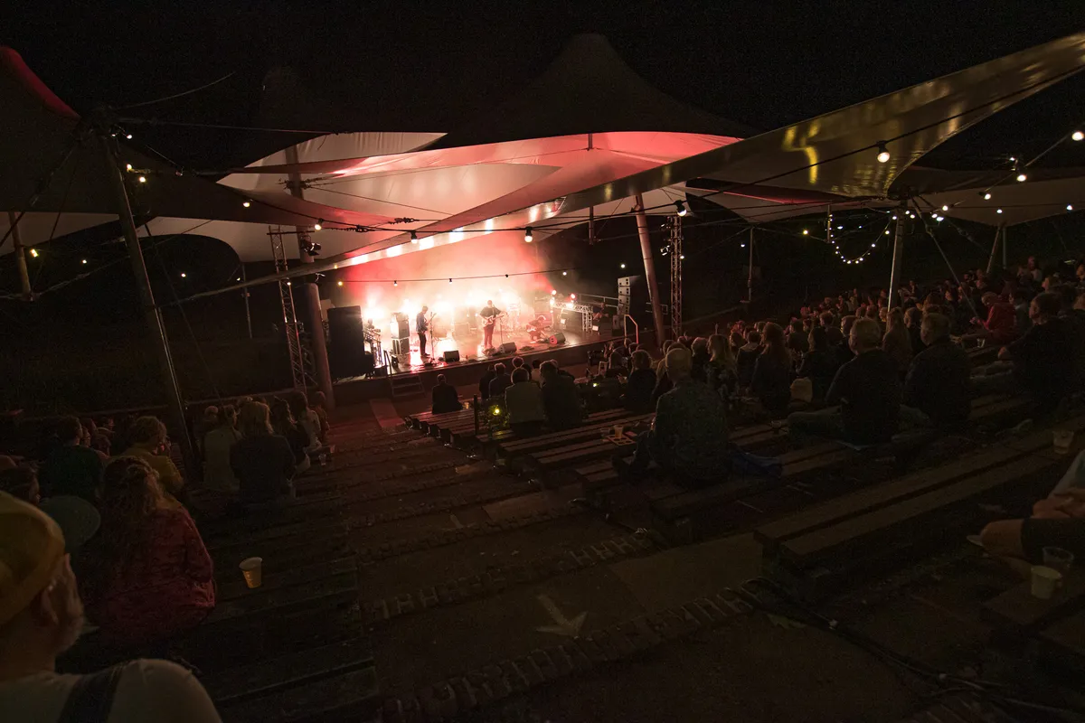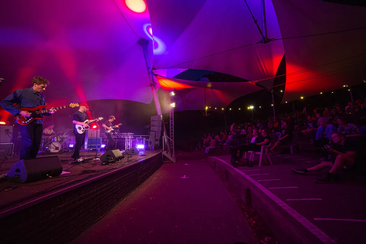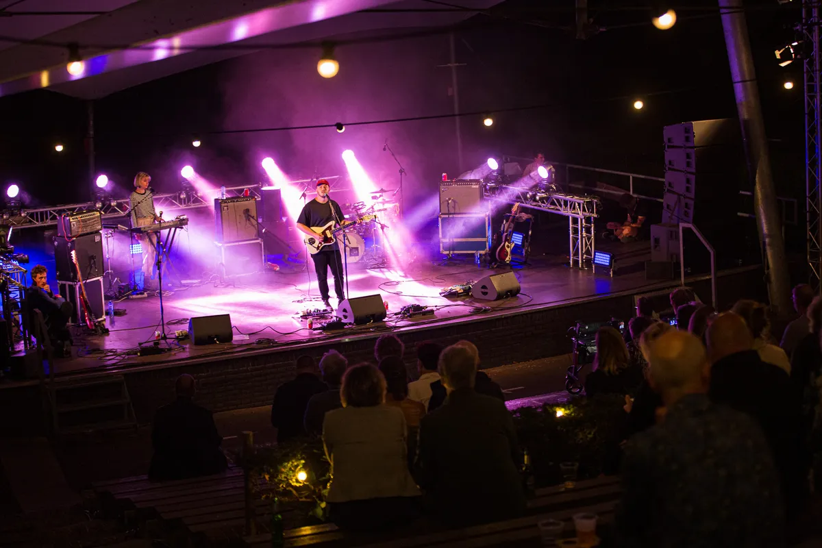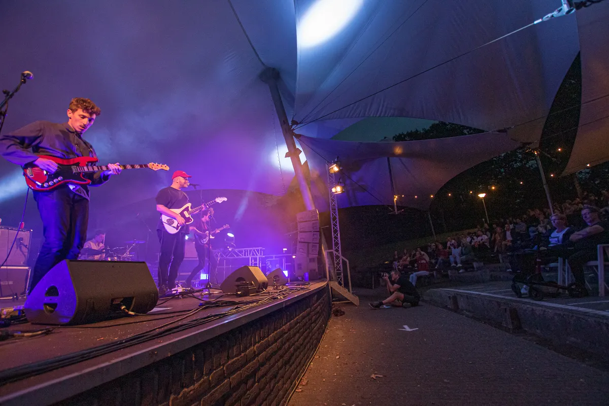 Tijdens de dagen dat muziekliefhebbend Nijmegen waarschijnlijk het liefste in Biddinghuizen was geweest voor een weekendje Lowlands, biedt Doornroosje op zaterdag 22 augustus een klein muzikaal lichtpuntje in coronatijden. Met de zomerse muziek van Waltzburg in het Openluchttheater De Goffert worden de herinneringen aan festivalavonden weer even opgeroepen, ondanks dat het kwik voor de het eerst in weken al vroeg op de avond onder de twintig graden zakt. Wellicht is het ook die combinatie van de kou en Waltzburgs vrolijke nummers die heimwee oproepen naar de festivalsfeer, lekker dicht tegen elkaar aan dansen en gezamenlijk uit volle borst meezingen. Vanavond moet het publiek netjes blijven zitten en mag er enkel geneuried worden, terwijl men troost vindt in de warme klanken van het Nijmeegse vijftal. Het gemis van een traditionele festivalzomer was echter nog niet zo duidelijk voelbaar als op deze zaterdagavond.