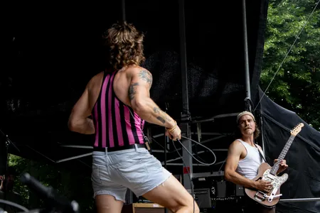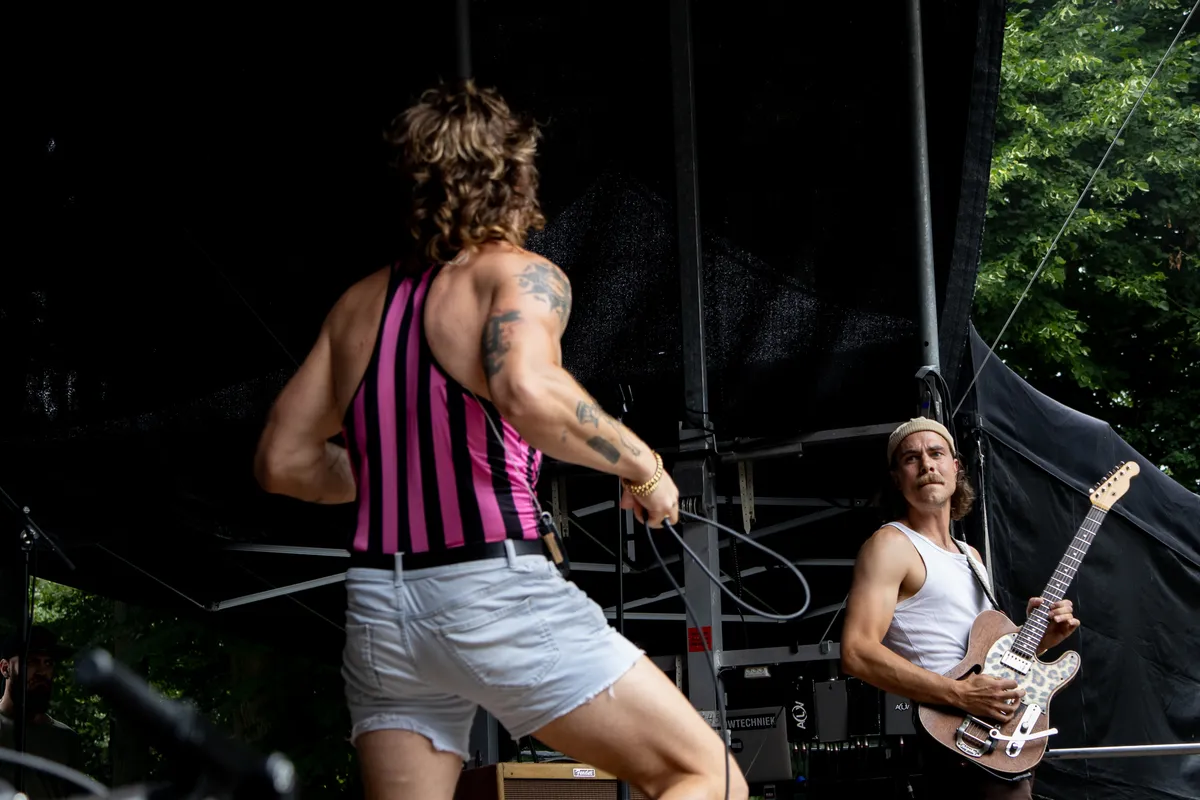 Vanaf het begin hebben zanger Arthur en Hammondman Henk een goede intensiteit. Met het swingende 'Sex Club' als tweede nummer schudt de band de laatste restjes reserve af. Niek, de gitarist met de gespierde armen van een drummer en een tijgerprint op zijn instrument, speelt ook fanatiek. Ondanks de bewolking zweet de band dan ook al snel als een vlot otters.
