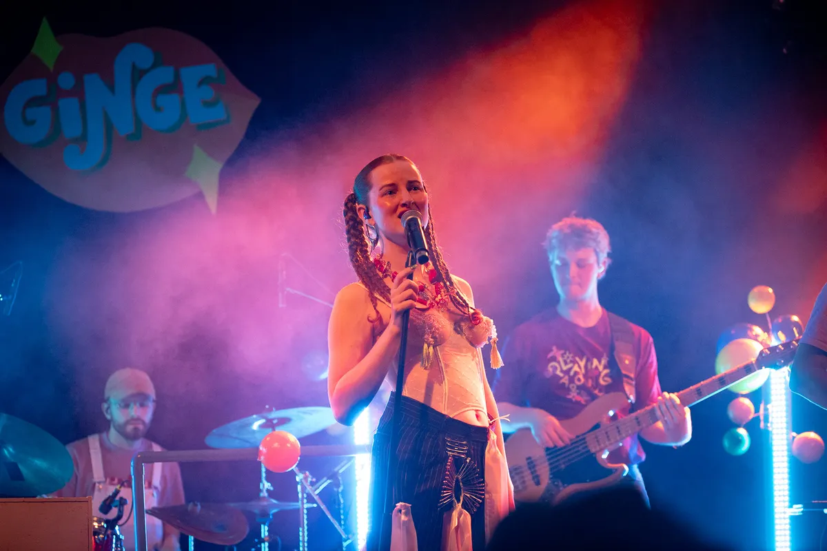Om acht uur gaan de deuren open, langzaam druppelt de zaal vol. Verschillende mensen vormen het decor van de avond, de één alternatiever dan de ander. Achterin staat een meisje met een bak lolly’s, meerdere in het publiek hebben er inmiddels al één te pakken gekregen. Ook staat er een kraam met merch, even kleurrijk als het hele imago van GINGE. Er staat een dj te draaien en het geroezemoes overheerst nog. Wanneer om iets over half negen GINGE eindelijk het podium opkomt, beginnen zij en haar band gelijk. Het eerste nummer, Trampoline, is ook het eerste nummer van het album.