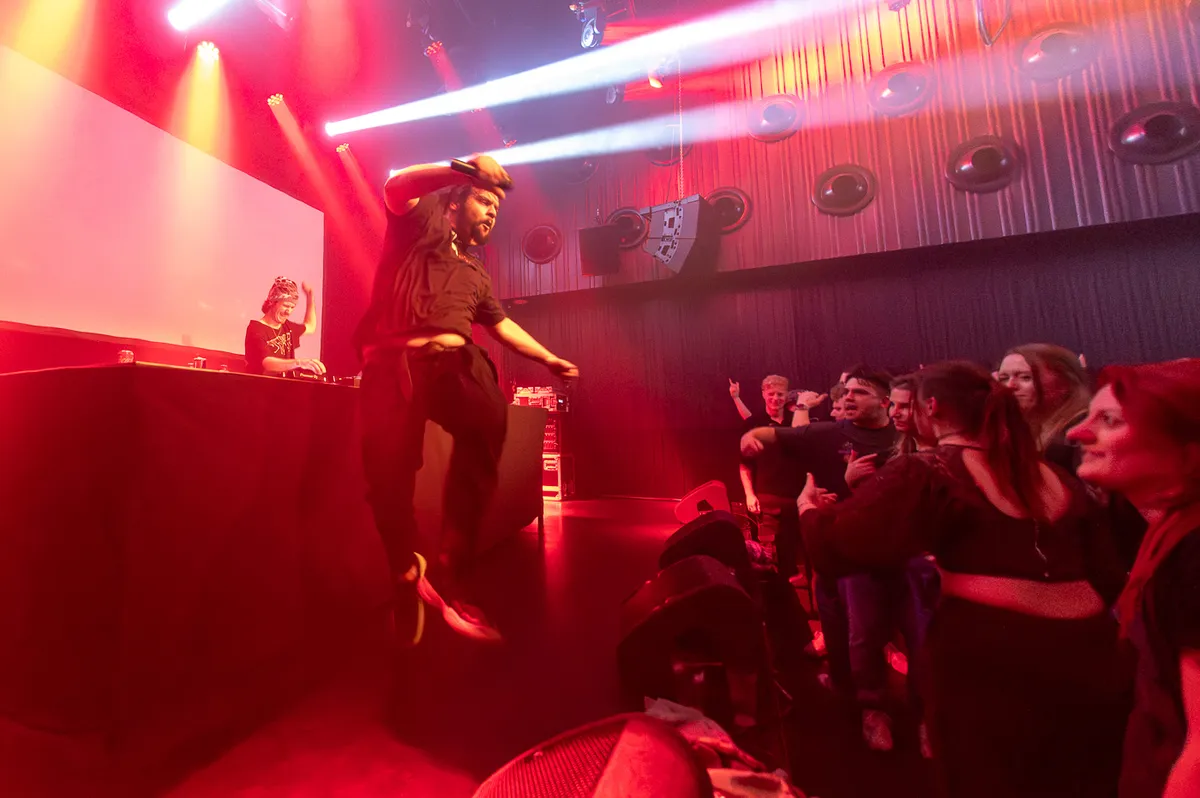 De Belgische rapper en DJ Parsa - die eerder het podium deelde met onder anderen Joost en Vieze Asbak - begint met rauwe hiphop, specifiek een nummer over “Pagga slaan”. Ik laat het aan jou over om dat op te zoeken, maar er staan in ieder geval twee nummers in de tracklist van Parsa die over dit onderwerp gaan. Een ding is zeker: Parsa is een showman. Terwijl een deel van het publiek het net iets te heftig vindt en vertrekt, blijft Parsa onverstoorbaar over het podium stuiteren om het publiek aan het springen te krijgen. Halverwege de set stap ik even naar buiten om wat frisse lucht te krijgen. Wanneer ik terugkom, heeft Parsa de decks van zijn DJ overgenomen en draait hij een mix van techno en hardcore. Structuur in de set is er klaarblijkelijk niet, want hij kapt nummers abrupt af en doet vooral waar hij zelf zin in heeft. Dat is eigenlijk zijn hele act. Parsa doet alleen waar hij zin in heeft.