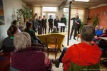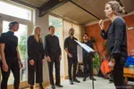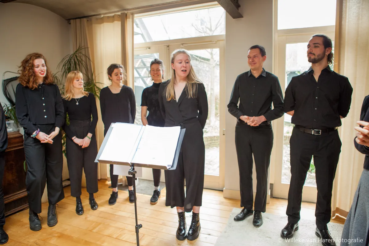 Vervolgens is het tijd voor iets heel anders dan we tot nu toe hebben gezien: een groep vrienden die besloten met elkaar te zingen en sinds kort bekend staan als het voz kamerkoor. We herkennen o.a. Maartje Gilissen (Out of Skin). En het is een bijzonder optreden daar in de zaal aan de Nieuwe Rijn, want het is het allereerste optreden van het koor! En dat ook nog eens met een volle zaal. Ook opmerkelijk: het koor is hun eigen dirigent. Verschillende koorleden wisselen de functie als dirigent af. Dat het vandaag de eerste keer is, daar is trouwens niets van te merken.