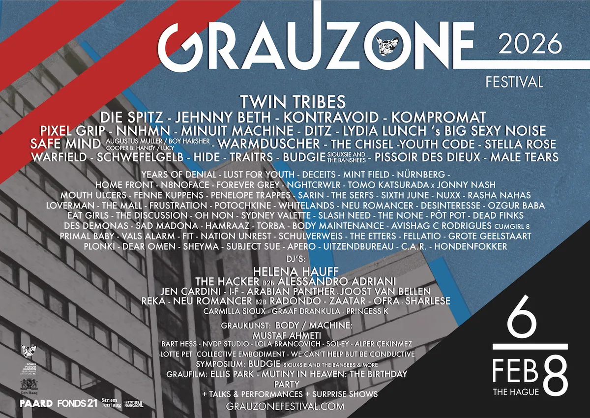 Grauzone is al jaren het festival waar je bands ziet voordat ze doorbreken. Waar postpunk, elektronica, experiment en performance niet in hokjes worden geduwd, maar elkaar juist versterken. In 2026 trekt het festival die lijn door en rekt ’m flink op. Met meer locaties, meer bezoekers (ruim 7.000, volledig uitverkocht) en een programma dat zich uitstrekt van rauwe gitaren tot queer performance, van coldwave tot beeldende kunst.