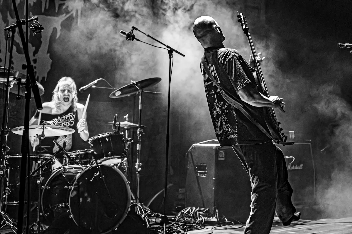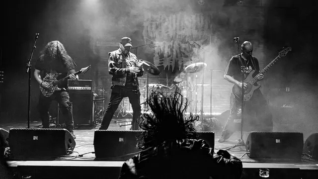 Het valt meteen op dat de Finnen met z’n drieën zijn, terwijl de band tot voor kort altijd vier bandleden telde. Een bassist ontbreekt. Misschien is hij backstage per ongeluk in de hakselaar van de vorige band gekukeld, we weten het niet. De heren van Rotten Sound spelen vandaag niet op hun eigen instrumenten. Frontman Keijo Niinimaa legt uit dat de instrumenten nog op een bevroren startbaan elders in Europa liggen te wachten op een volgende vlucht. Zelfs het essentiële HM-2-gitaarpedaal (voor de kenmerkende kettingzaaggitaarsound) en het eigen drumstel van Sami Latva ontbreken. Latva speelt de meest technische drumpartijen die de Muziekgieterij dit jaar te horen krijgt op het drumstel van de vorige band. Het voelt en klinkt als een gemis. Alsof we van een koude kermis thuiskomen.