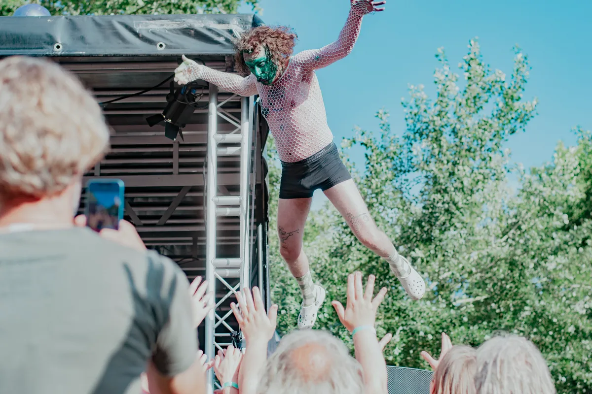 Maar goed ook dat men werd voorbereid op wat absurdistischer acts, want Boterboter was de volgende act, in de kleinere tent. Vanachter zijn synths trakteerde hij het publiek op liedjes, poëzie en cabaret. En een letterlijke vertaling van ‘...Baby one more time’. HIj was namelijk gevraagd om ‘Toxic’ in een modern jasje te steken, en er was volgen hem weinig minder toxic dan de tekst ‘Hit me baby one more time’. Een punt dat hij maakte door ieder woord zo rauw mogelijk te schreeuwen. Het werd er inderdaad erg naar door. Het bleef ook lichtvoetig door liedjes als ‘Dartelen’ die oproepen om, welja, rond te dartelen.