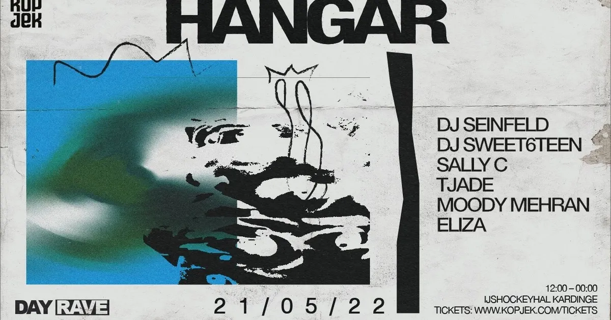 Omschrijving: KopjeK Hangar is één van de slachtoffers van de coronacrisis, die meerdere keren verplaatst is en steeds weer afgeblazen heeft moeten worden. Maar nu is het eindelijk zover! Een hele dag dansen in een enorme loods. De line-up? DJ Seinfeld, Sally C., DJ Sweet6teen, Tjade, Moody Mehran en Eliza.
