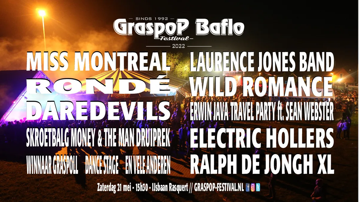 Omschrijving: Zoals elk charmant festival in het Noorden is Graspop Baflo begonnen als initiatief van de jeugdsoos dat geleidelijk aan uit de hand gelopen is. Op het affiche van het festival, dat tegelijkertijd met het Piratenfestijn plaatsvindt, staan onder andere Miss Montréal, Money & The Man, Daredevils en RONDÉ.