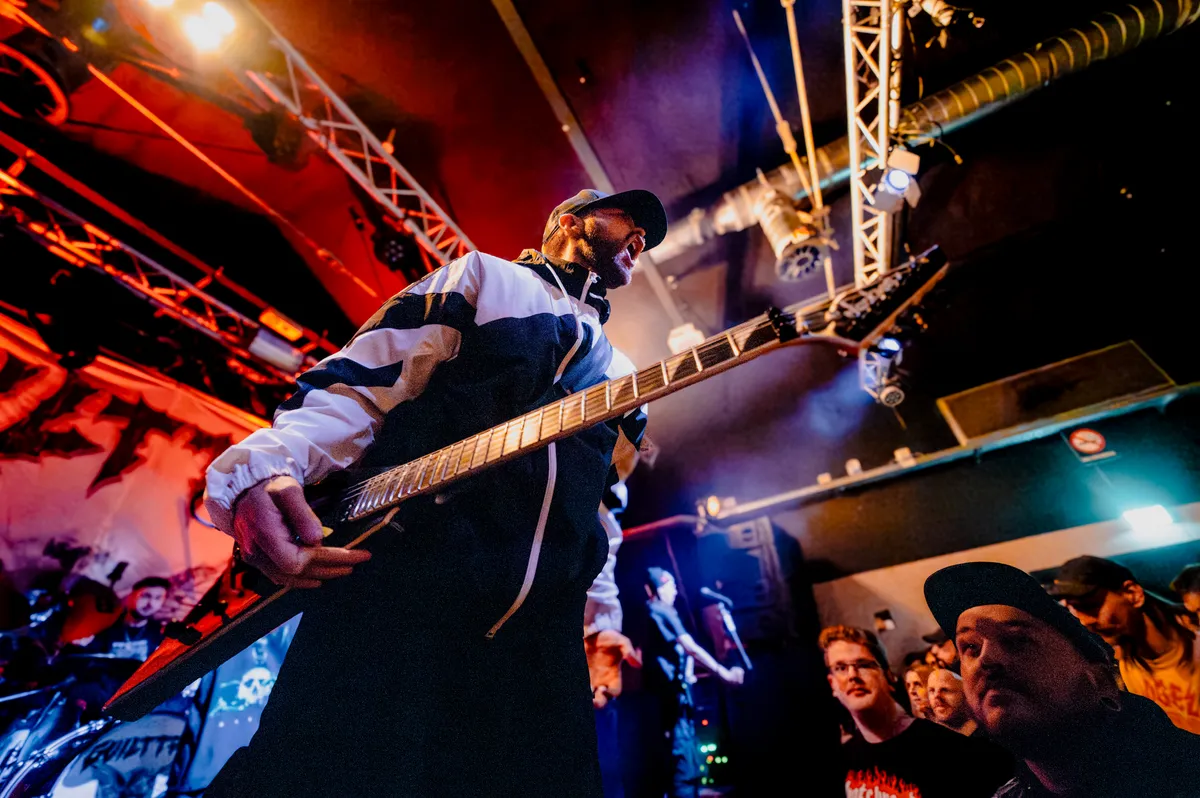 Maar net zoals vorig jaar in de Little Devil komt Guilt Trip niet alleen naar Hall of Fame. De aftrap komt van de Parijzenaren Sorcerer die we in 2023 ook al in de Stationsstraat konden zien. Toen maakte het vijftal indruk, hier is het duidelijk dat de band in de laatste fase van haar tour zit met minder energie dan gebruikelijk. Dat lijkt de diehard-fans weinig uit te maken; een kleine, maar fanatieke moshpit begint direct met two-steps en schreeuwt luidkeels mee met frontman Dom. Het nieuwe nummer 'Badlands' van hun album Devotion uit 2024 vormt een stevig begin, ondanks de wat vermoeide performance van de band. Als Guilt Trip's eigen Jay Valentine het podium op komt bij 'In Arms of Mortality' – een nummer dat beide bands samen hebben uitgebracht – is het publiek duidelijk in de ban van de samenwerking. De energie stijgt en de rauwe vocalen van Jay brengen een nieuwe impuls in de zaal, wat de intensiteit van de mosh alleen maar verhoogt.