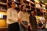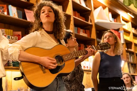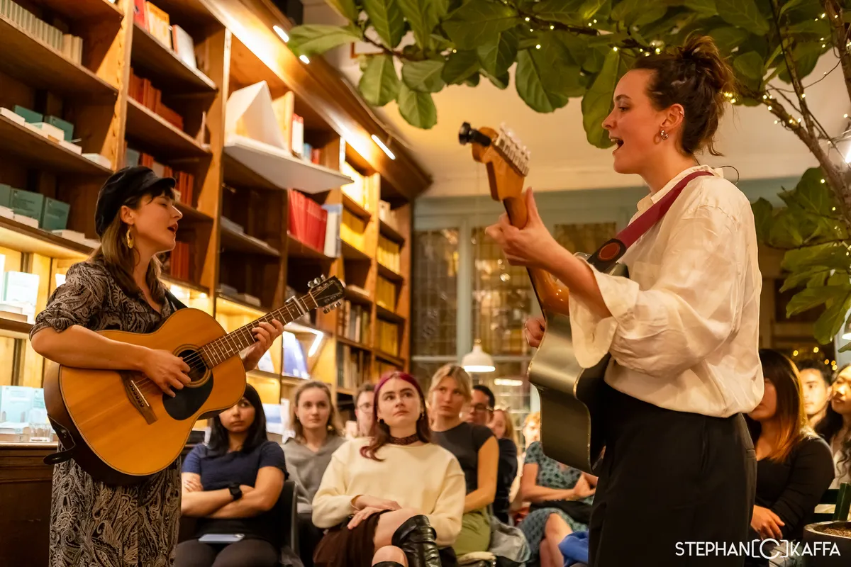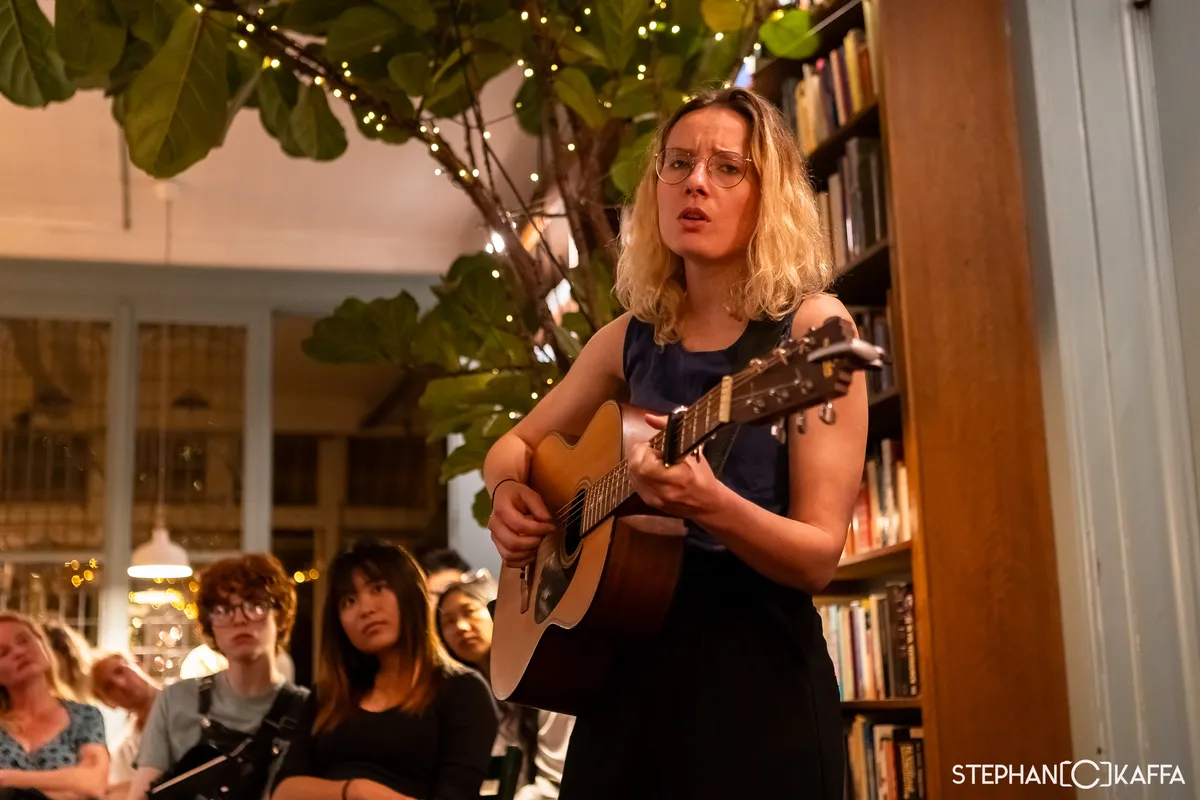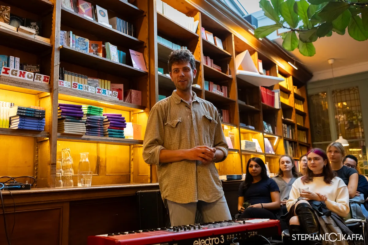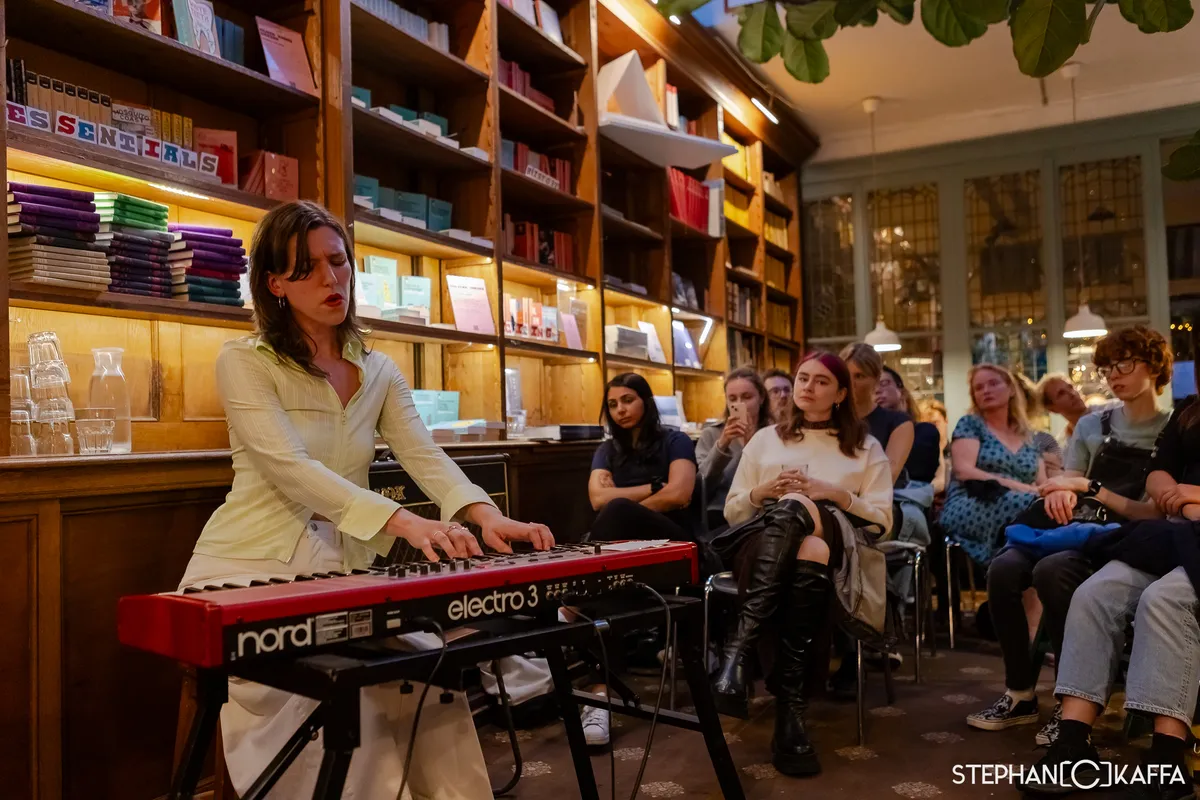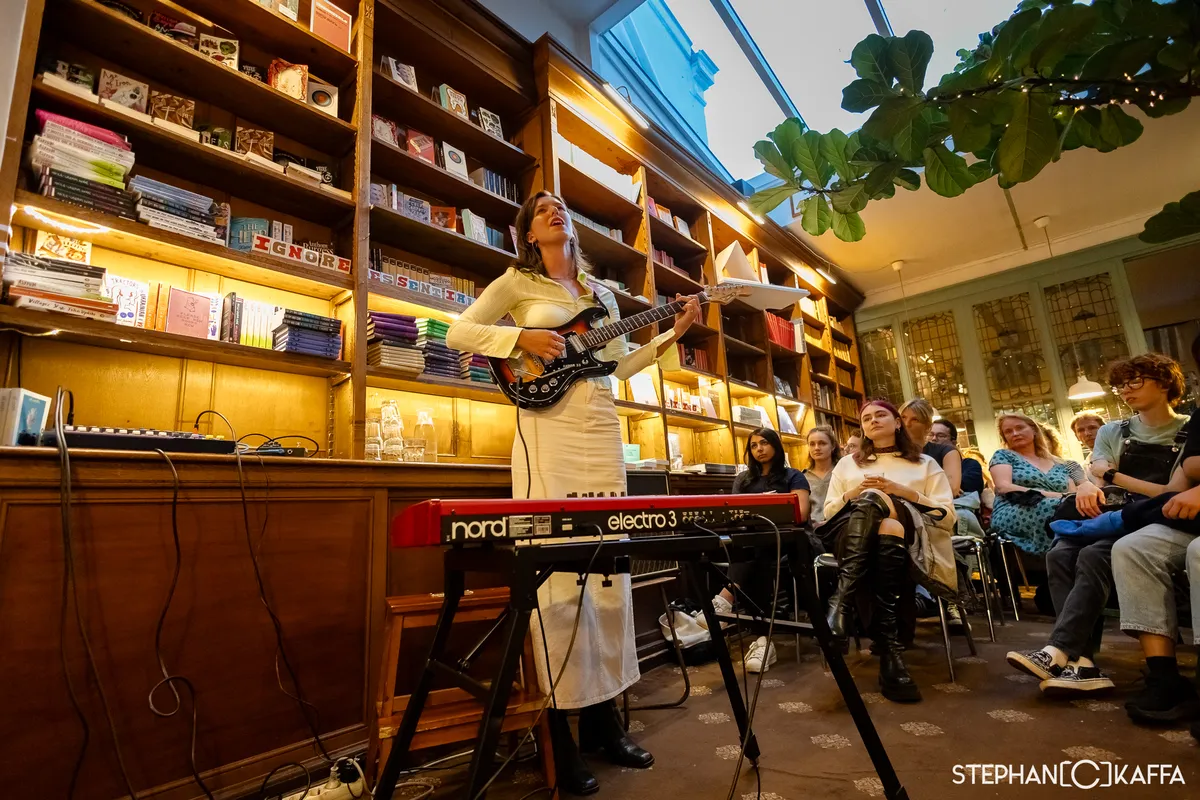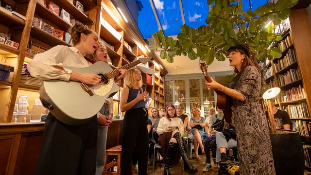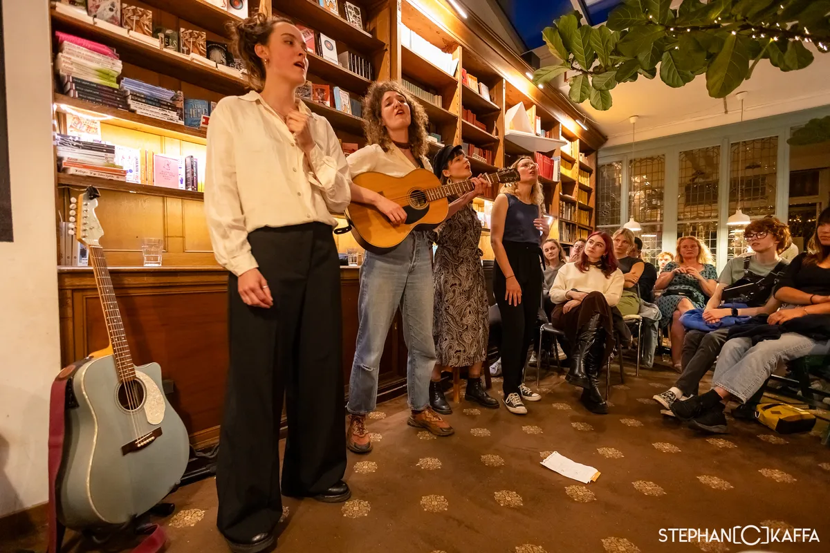 Altijd al willen verdwalen in een boekenwinkel met een historie van meer dan honderd jaar? Overdag is Bookstor een plek om ontspannen een kop koffie te drinken of om op te gaan in een inspirerend boek. Vanavond staat er een menigte van opvallend formaat geduldig voor de deur te wachten. Middenin die winkel organiseert Niels de Jonge namelijk 'Sounds Between the Shelves'. Letterlijk op te vatten dus, een muziekprogramma tussen de boekenkasten aan de muur. Vanavond warmen synthpopper Alison Jutta, oorspronkelijk uit Antwerpen, en vier songwriters met een thuisbasis in Berlijn als Song of the Sirens het knusse zaakje op.