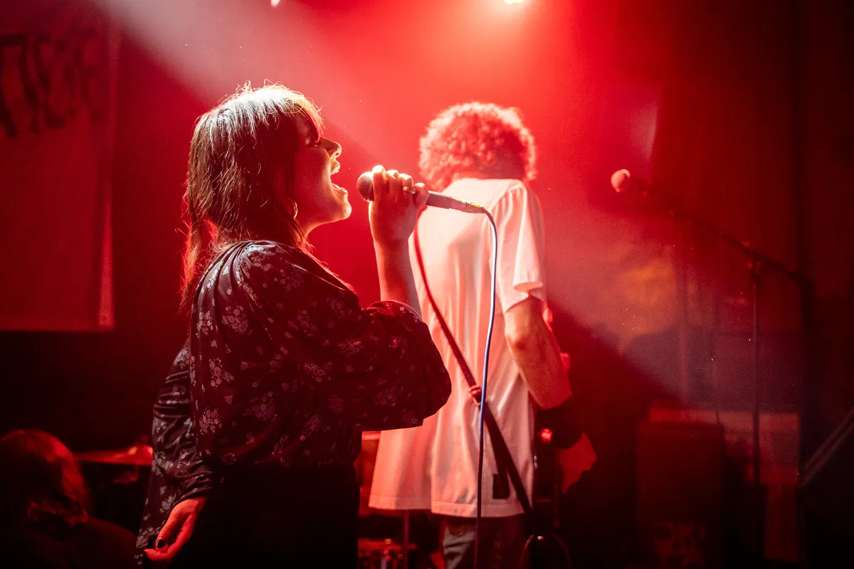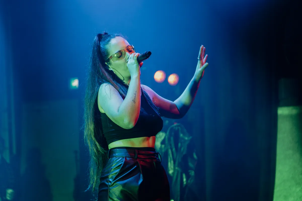 Met al dat rennen tussen locaties komen we net op tijd om Ysa Bermejo midden in de kleine zaal van PAARD wild om zich heen te zien zingen. Het publiek vormt een halve ring om haar heen, waar ze welhaast als een wilde stier uit probeert te ontsnappen. Of daagt ze de mensen juist uit te komen? Dit is performance mensen, wat een presentie. We horen Tarantino part 1, veel Spaans gelardeerd met Engels. Terwijl Bermejo terug het podium op rolt kondigt ze, helaas, het laatste nummer aan: Tarantino part 2. Een salsa-suave sound ligt over zingende synthwaves op een bedje van dwingende drumbeats. De heupen gaan los in de zaal. Hoewel Ysa zelf multi-instrumentalist is, wordt muzikaal alles ondersteund door slechts één man: Rico. Met een basgitaar, een keyboard en een laptop maakt hij de hele soundscape om de pompende aanwezigheid van Ysa te omlijsten en te stutten. Ysa is weinig corazon. Ysa is mucho macho mujer. Ook hier weer: rauw. Weliswaar rauw rollend over salsa en beats, maar toch in your ff-ing face.