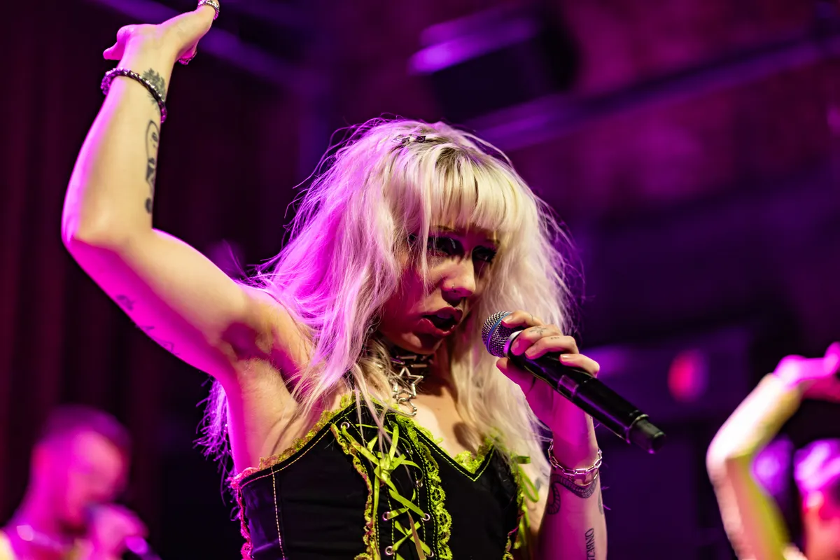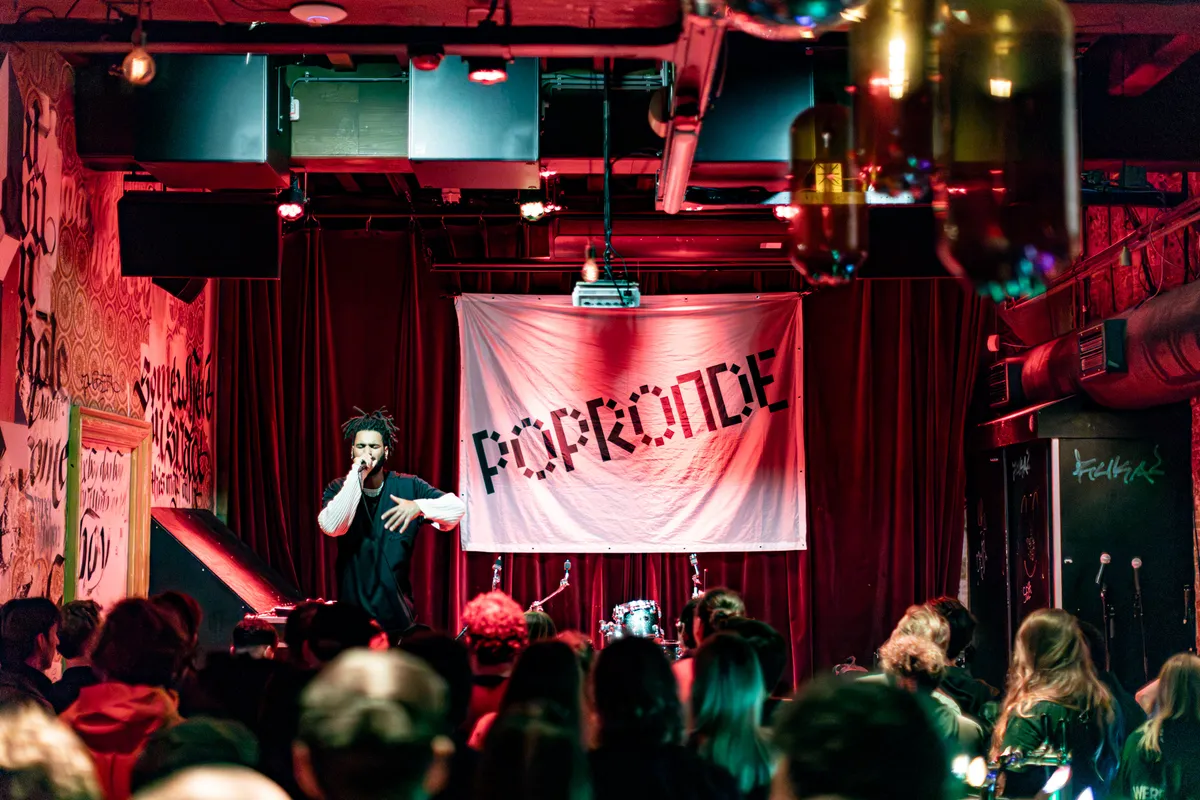 Kijk, dit is het risico van de Popronde. We lieten de climax van Ruhwel achter ons omdat we de opening van Yaro Mila wilden meekrijgen, en dan begint ze met vertraging. Maar het is het waard om haar te zien beginnen en de reactie van de zaal te zien, want ze staat er gelijk. Een toetsenist, een gitarist en twee danseressen dragen doorschijnende neon-gele visnet-shirts met daaronder afgeplakte tepels. Yaro Mila zelf draagt een zwarte leren jas, een fantastische Lady Gaga-waardige korte jurk met fishnet-stockings en zwart-witte blokhak laarzen. De eenduidige aankleding van de band versterkt de extravaganze van Yaro Mila zelf, zoals ook de twee danseressen dat doen.