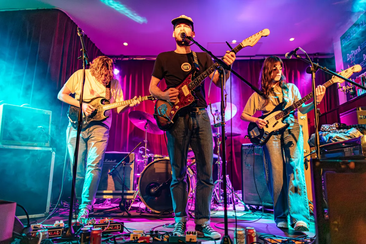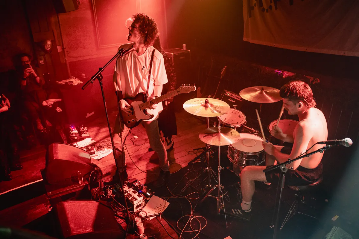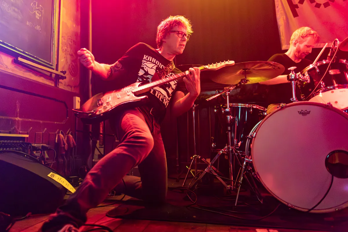 Het is druk en warm voor het podium. Wat niet helpt is dat O’Caseys daar een aantal tafels heeft laten staan waar bezoekers aan hun hamburgers zitten. Rustig eten zit er voor hen echter niet in, want The Mocks gaan hard en het publiek, waarvan een deel speciaal voor de band naar Den Haag is gekomen, kan nauwelijks stilstaan. Halverwege het optreden schroeven de drie heren het tempo wat terug met een psychedelisch instrumentaaltje, maar al gauw gaat het gas er weer op. The Mocks komen uit Nieuw-Vennep, maar passen prima binnen de Haagse beattraditie.