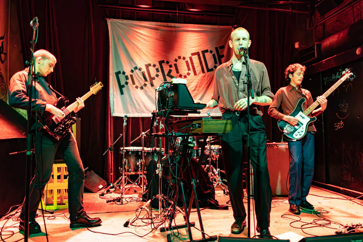Ondertussen klinkt in het Paardcafé beschaafd gemompel terwijl de drie heren van Dorpsstraat 3 met de rug naar het publiek gekeerd pielen aan de instrumenten. Er wordt aan knopjes gedraaid, loops worden getest en gitaren gestemd. Dan, zonder erkenning dat de zaal er is, trapt het drietal af met ‘Een Groot Gevaar’. Over de stem van zanger/soundmaster en toetsenist Merlijn Breedland, die net als Spinvis meer praat dan zingt, zit een lichte galm. Merlijn klinkt echter feller en punkier, als Nick Cave op zijn vuigst. De bas, bespeeld met plectrum, plonkt, kil dreigend, zonder warm te worden. De twaalfsnarige gitaar klinkt als Turkse bağlama, met veel reverb en galm. “Mag ik nog een biertje?” vraagt de bassist na het eerste nummer. Zonder verder iets te zeggen gaat de band verder. Het is duidelijk dat publieksinteractie bij Dorpsstraat 3 onderhavig is aan dezelfde deconstructie als hun muziek. De barman voelt de stemming goed aan, dus de bassist krijgt dat biertje nooit. Wel krijgt de band applaus van een goed gevuld Paardcafé.