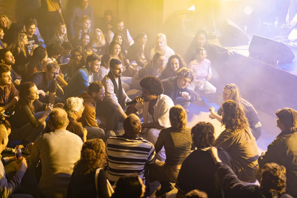 Vanuit die pijn is Ruhwel gegroeid zoals ook zijn act hier voor onze neus groeit. De artiest heeft de pijn van shoegaze. Maar in plaats van naar zijn schoenen te kijken, kijkt hij je aan met zijn ziel, en dan probeer je daar ineens Caribisch te dansen omdat hij je heeft geraakt en meetrekt. Het is ongelooflijk te zien hoe de band een zaal stijve Hagenezen met passie van links naar rechts naar achter en naar voor laat bewegen. “En nog een rondje!” Zanger en zangeres zwepen de volle zaal op en wie niet meedoet is een hark. De toetsenist tovert een steeldrum uit zijn twee meter lange Roland terwijl we omlaag gaan op de donkere tonen van de vette altsax. “En omhoog! Denke denke denke!”