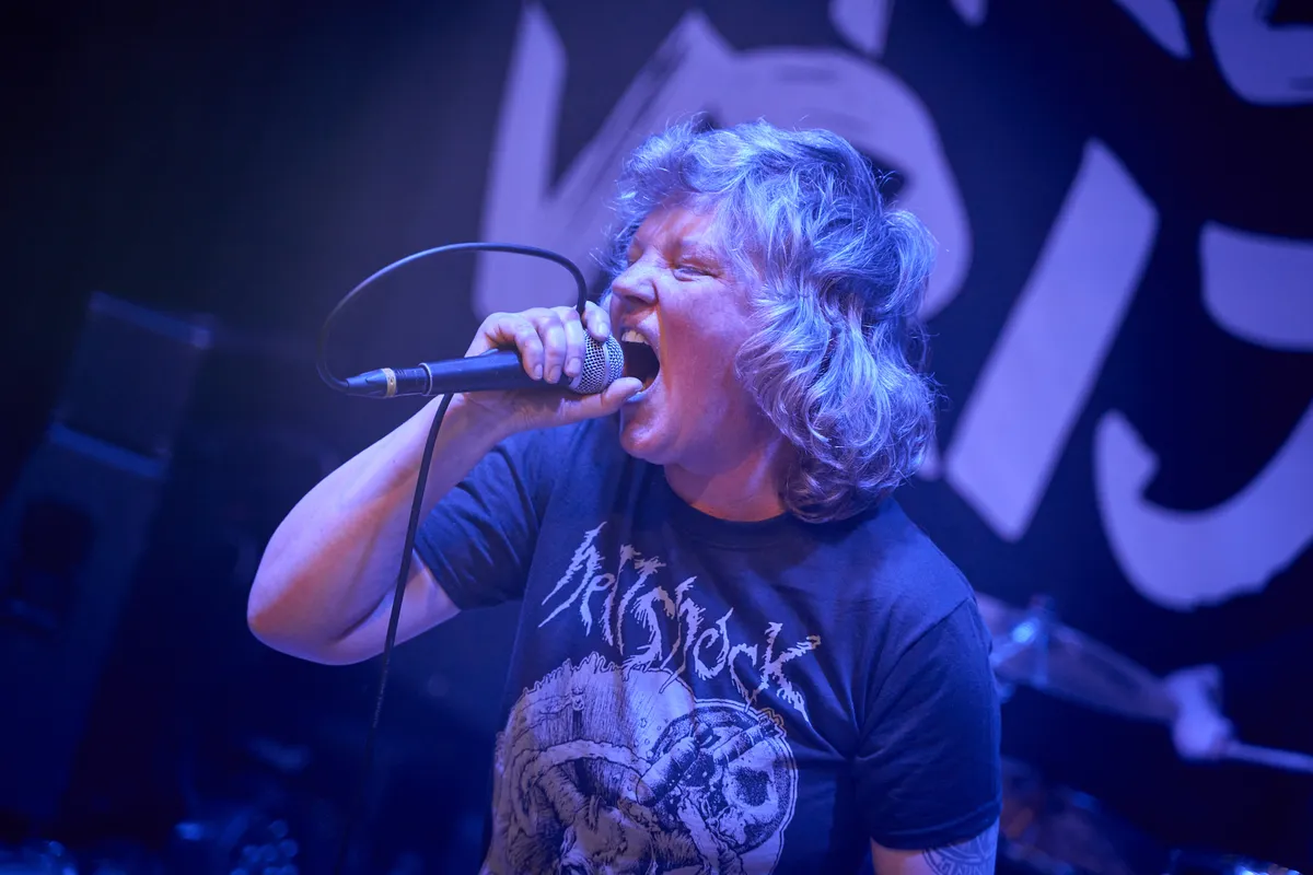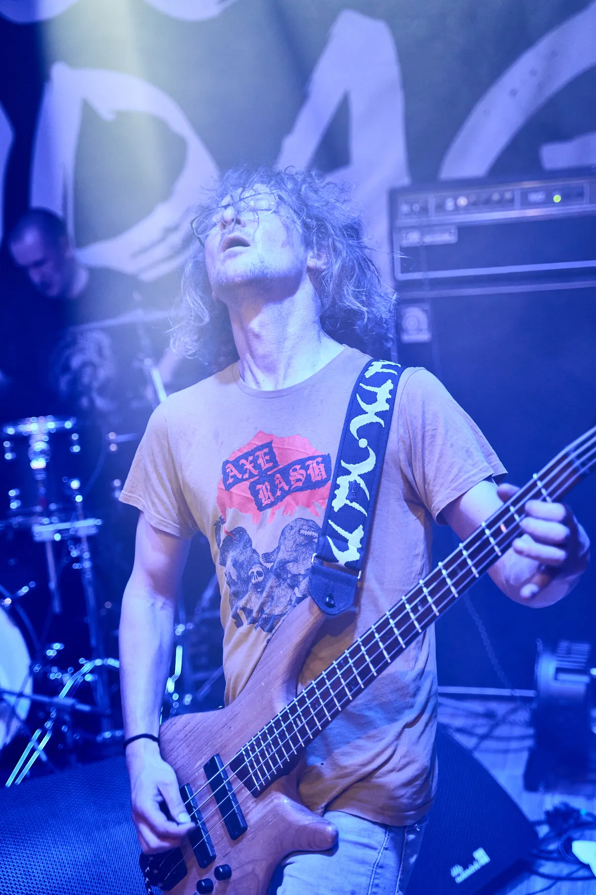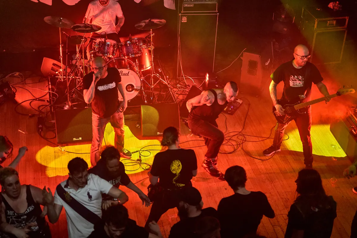 Het kwintet Stadjers uit Groningen blaast zijn explosieve crust/hardcore punk meteen onverbiddelijk de zaal in. Met daarin centraal de songs van het iets meer dan een jaar geleden verschenen debuutalbum Vrede Die Geen Vrede Is. Aangevoerd door de zich onophoudelijk in het rood schreeuwende en jongensachtig ogende vocaliste Eva Oling – ‘one of the boys’ –, vinden Nederlandstalige teksten die doortrokken zijn van bittere maatschappijkritiek en sociale vervreemding als een spervuur hun weg. De frustratie en woede kent het plaveisel van die denderende mix crust en hardcore punk, die onstuimig is aangevuld met een dosis aangenaam botte D-beat en in zijn snelheid nader wordt opgepookt door gemeen klinkende old school thrashriffs.