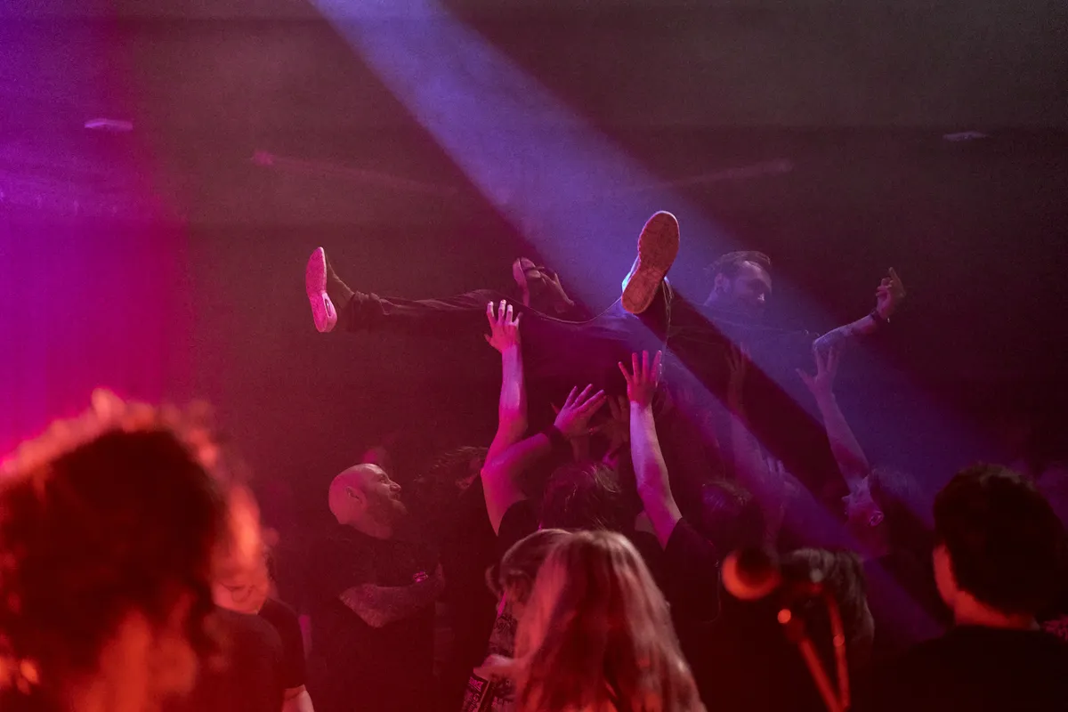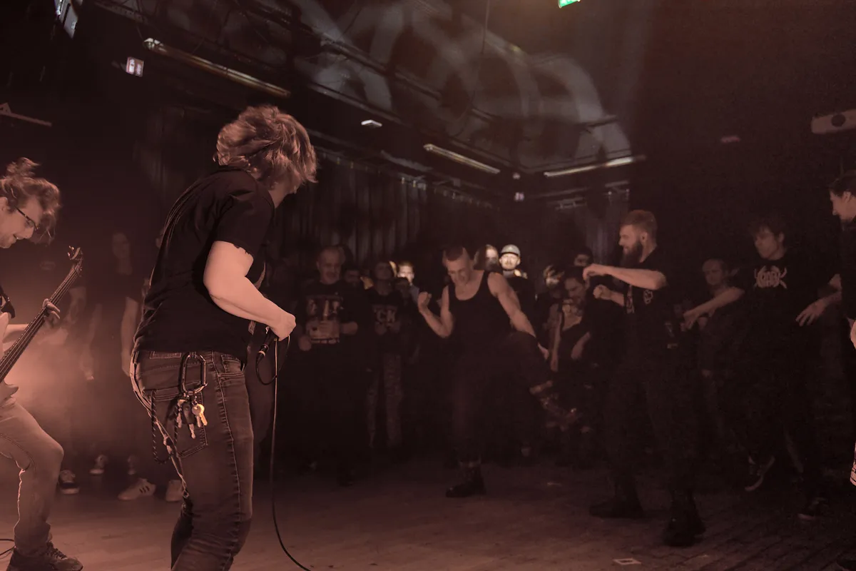 Het gros van de toehoorders lijkt vooral afgekomen te zijn op de navolgende twee acts. Die brengen dan ook genóeg aanstekelijke muzikale branie voor het voetlicht, “gewoon’’ zonder al te veel fratsen en direct in de kern. Te beginnen met STRESSSYSTEEM. Het kwintet Stadjers uit Groningen blaast zijn explosieve crust/hardcore punk meteen onverbiddelijk de zaal in. Met daarin centraal de songs van het iets meer dan een jaar geleden verschenen debuutalbum Vrede Die Geen Vrede Is.