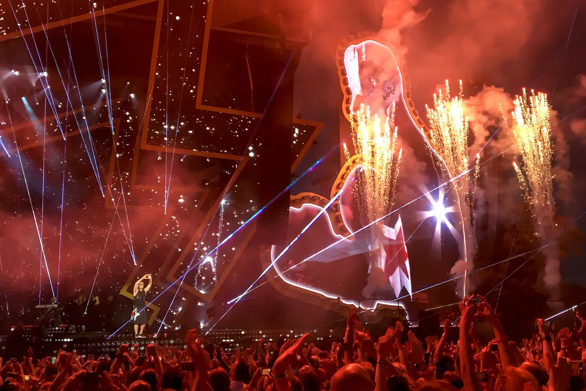 Sterk zijn die hits nog onverminderd. De tekst van 'Come Undone' hoeft echt niet op het scherm geprojecteerd te worden om de hele weide mee te laten zingen, 'Feel' krijgt alle handen torenhoog de lucht in. Tijdens 'Kids' wordt Kylie Minogue probleemloos vervangen door één van de achtergrondzangeressen, bij 'Something Stupid' is de rol van Nicole Kidman voor een vrouw uit het publiek - die met een clownesk masker en geholpen door een stemvervormer het refrein 'mee mag zingen'. Dat entertainment en muziek elkaar ook prima versterken blijkt bij nieuwe single 'Love My Life', dat als een hit onthaald wordt terwijl Robbie in een bokshandschoen boven het publiek zweeft.