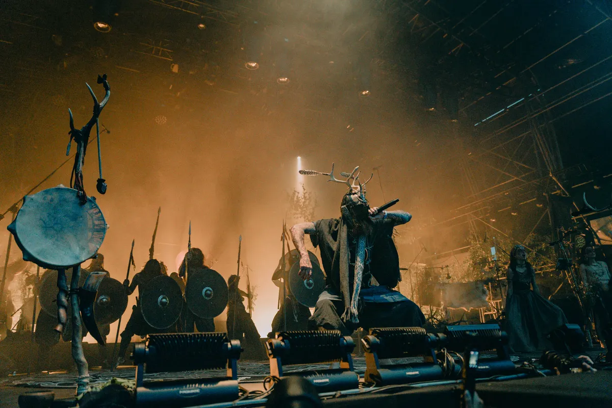 Het decor is indrukwekkend: botten, vlaggen, bomen, alles tot in detail uitgewerkt. De instrumenten zijn minstens zo bijzonder: gemaakt van botten, dierenhuiden, bronzen rammelaars en gereconstrueerde historische objecten. Daarbovenop komen stemmen die klinken als echo’s uit een ver verleden: keelzang, rituele zang, bezwerende teksten en hypnotiserende percussie. Het geheel voelt als een trance, een ceremonie waarin je volledig kunt verdwijnen, al is het visuele spektakel zo intens dat je je ogen nauwelijks van het podium af kunt houden. Want er gebeurt veel: op het podium staan talloze performers, sommigen met schilden of speren, anderen met ontblote bovenlijven en zwarte schmink. Ze dansen, marcheren en bewegen perfect in sync met elkaar en met de muziek. Ook de lichtshow is nauw afgestemd en versterkt de bijzondere sfeer.