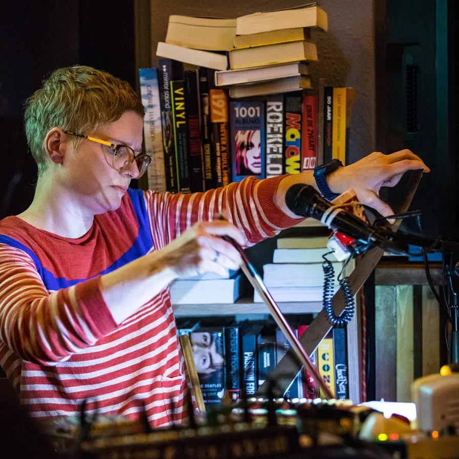 Met dat in ons achterhoofd gaan we deze zaterdag op ons stoeltje zitten in afwachting van mooie muziek. Allereerst is het de beurt aan The Puddle Parade, het soloproject van Ellen Evers. “Haar heb ik zien spelen bij een huiskamershowtje zo’n vijftien jaar geleden. Dat was mooi, maar wat ik vanavond in de soundcheck hoorde was nog mooier”, kondigt Stefan haar aan. Deze avond wordt ze bijgestaan door Robby Wouters op saxofoon, die we onder andere kennen als gitarist van I am Oak en van zijn soloproject Robby de Selby. We horen experimentele popliedjes vol samples en loops. Bevreemdende geluidjes worden onder meer geproduceerd door kookwekkers, een zingende zaag, speeldoosjes, melodica en veel effectpedalen. Door de herhalende loops heeft de muziek wel iets trance-opwekkends en ritmisch, waardoor associaties met techno en minimal ook niet ver weg zijn. De onderkoelde zang van Ellen en het speelse sax-spel van Robby maken het geheel wat aardser, maar toch ook expres afstandelijk. Op de achtergrond zien we YouTube-clips van de tekenfilm Keepvogel, wat nog voor een extra bizar tintje zorgt. “Bedankt dat jullie zo stil zijn”, zegt Ellen nog en op dat moment valt er net een leeg koffiekopje om.