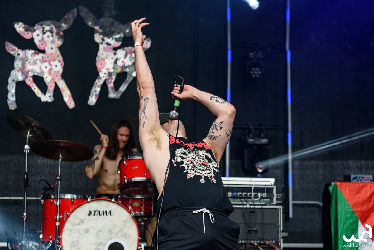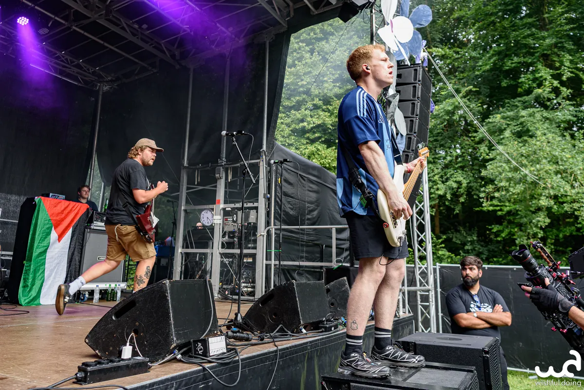 Het daaropvolgende 'Woonrecht' staat ook als een huis, met een makkelijk mee te schreeuwen chorus. Een onverwachte gastredacteur probeert mijn pen te stelen om zelf wat aantekeningen bij te schrijven, maar met een moordlustige blik weet ik hem af te wimpelen. Bij navraag blijkt dat hij wilde melden dat tussen al het gelikte geluid er eindelijk een formatie is die niet bang is om te rammelen en af en toe op de bek te gaan. Roerend mee eens! De setlist is inmiddels meer een partijprogramma geworden met een apocalyptisch klinkende track over de klimaatcrisis, en we gaan toch allemaal dood, dus waarom niet moshen alsof er geen morgen is?