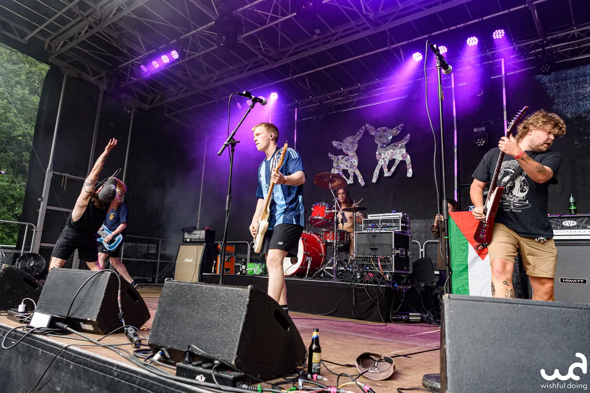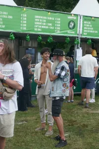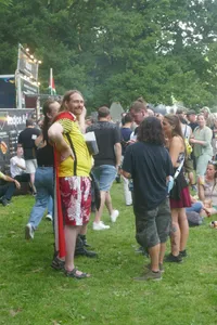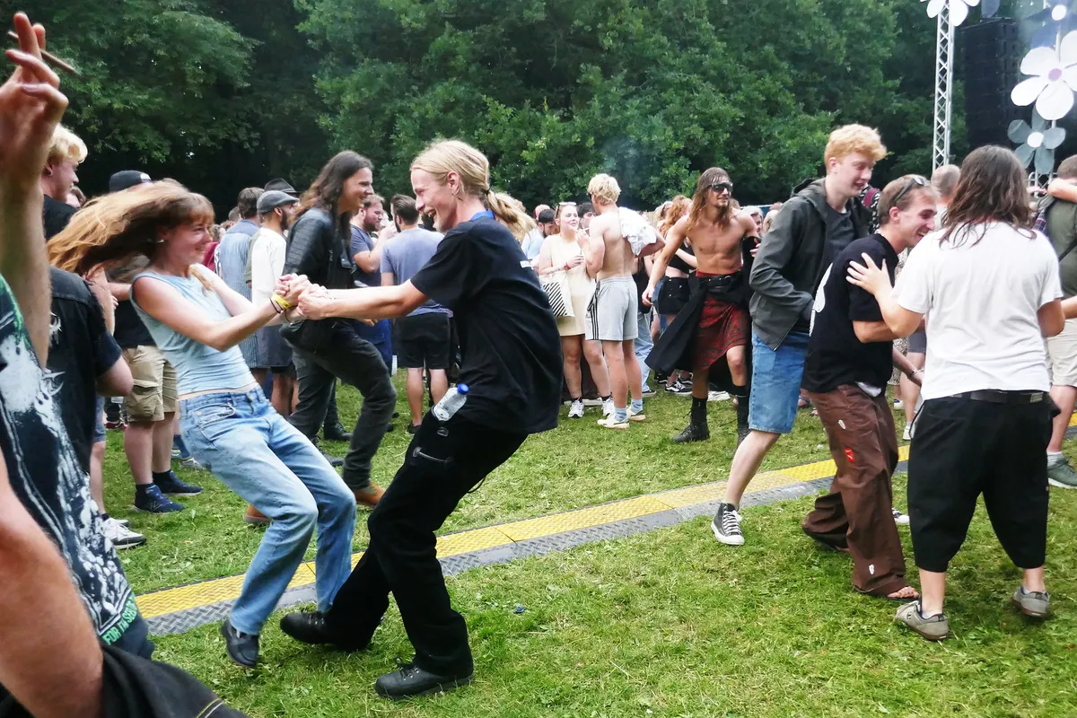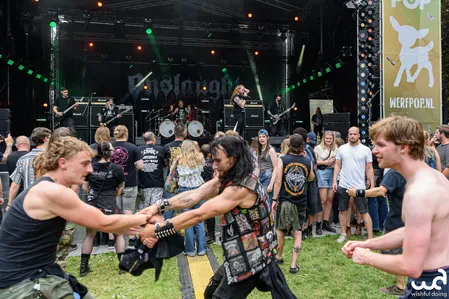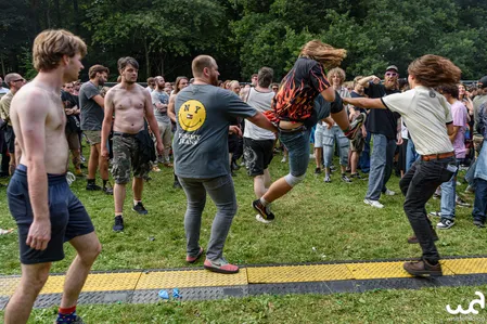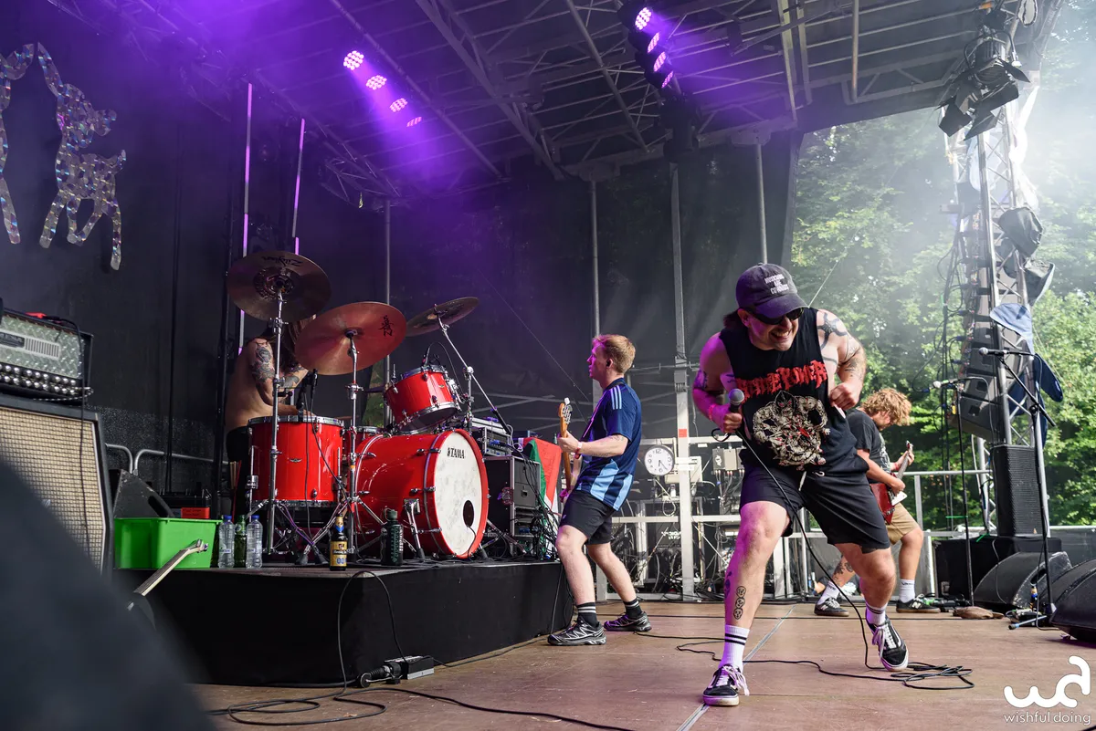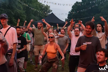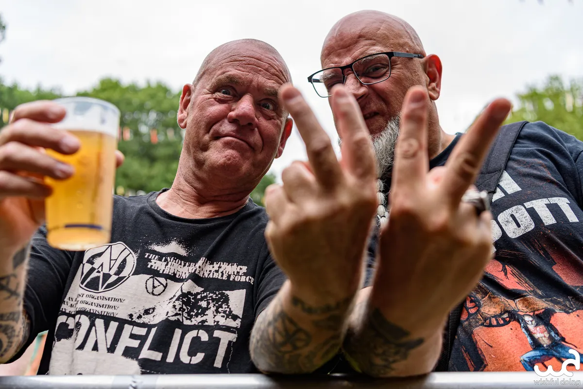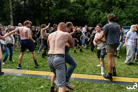 Deze roekeloosheid is ook niet leeftijdsgebonden, want zelfs een paar mensen die al AOW ontvangen zijn niet bang voor blauwe plekken. Terwijl de excessen van de bio-industrie bezongen worden, verandert het veld in een slachthuis. En denk niet dat dit het soort punk is waarbij de nummers prematuur eindigen, want alles heeft een nette looptijd. Uw verslaggever krijgt van de zanger een bierflesje aangereikt om te openen. Dienstbaar mep ik voor hem de dop eraf op de rand van het podium (of anders heb ik per ongeluk gratis drank teruggegeven). Na een paar slokken gaan we door met de track 'Sloop De Barkrukken', en op het gebeuk van de drums besluiten feestgangers kung-fu duels en piledrivers op elkaar uit te voeren.