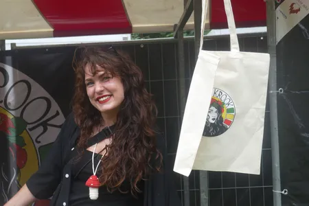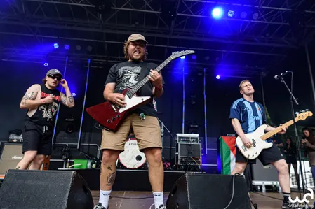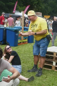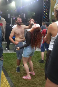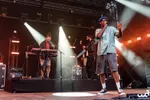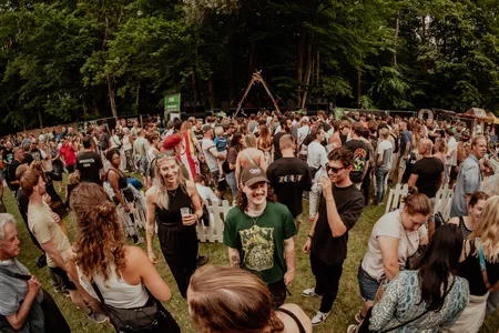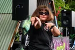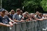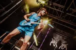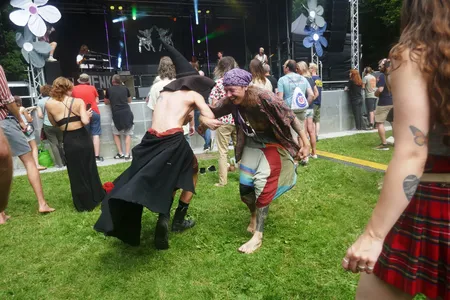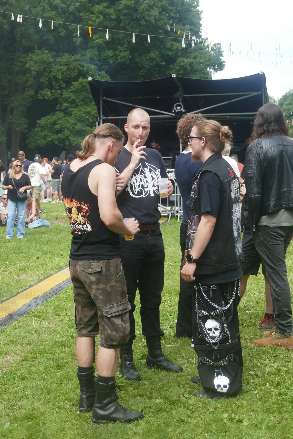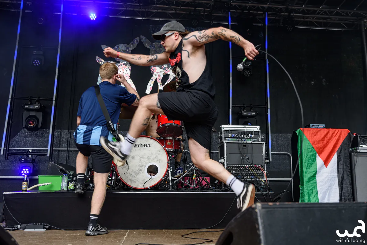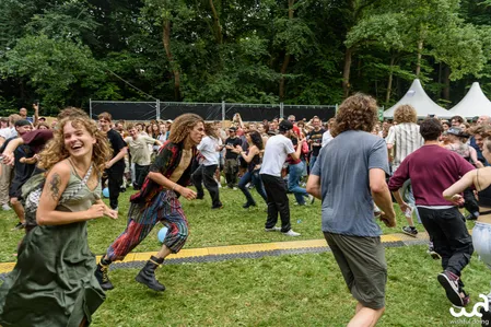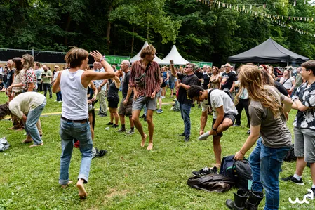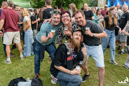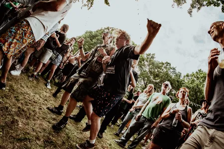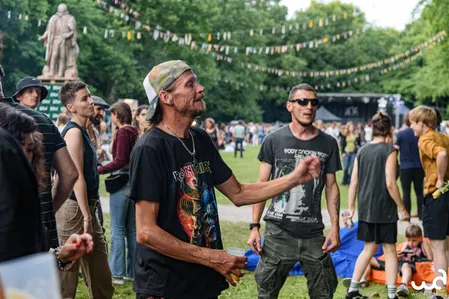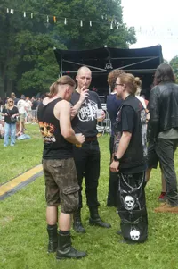 Deze roekeloosheid is ook niet leeftijdsgebonden, want zelfs een paar mensen die al AOW ontvangen zijn niet bang voor blauwe plekken. Terwijl de excessen van de bio-industrie bezongen worden, verandert het veld in een slachthuis. En denk niet dat dit het soort punk is waarbij de nummers prematuur eindigen, want alles heeft een nette looptijd. Uw verslaggever krijgt van de zanger een bierflesje aangereikt om te openen. Dienstbaar mep ik voor hem de dop eraf op de rand van het podium (of anders heb ik per ongeluk gratis drank teruggegeven). Na een paar slokken gaan we door met de track 'Sloop De Barkrukken', en op het gebeuk van de drums besluiten feestgangers kung-fu duels en piledrivers op elkaar uit te voeren.