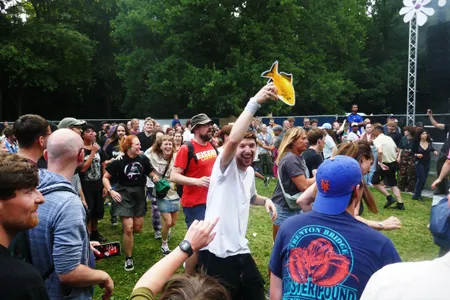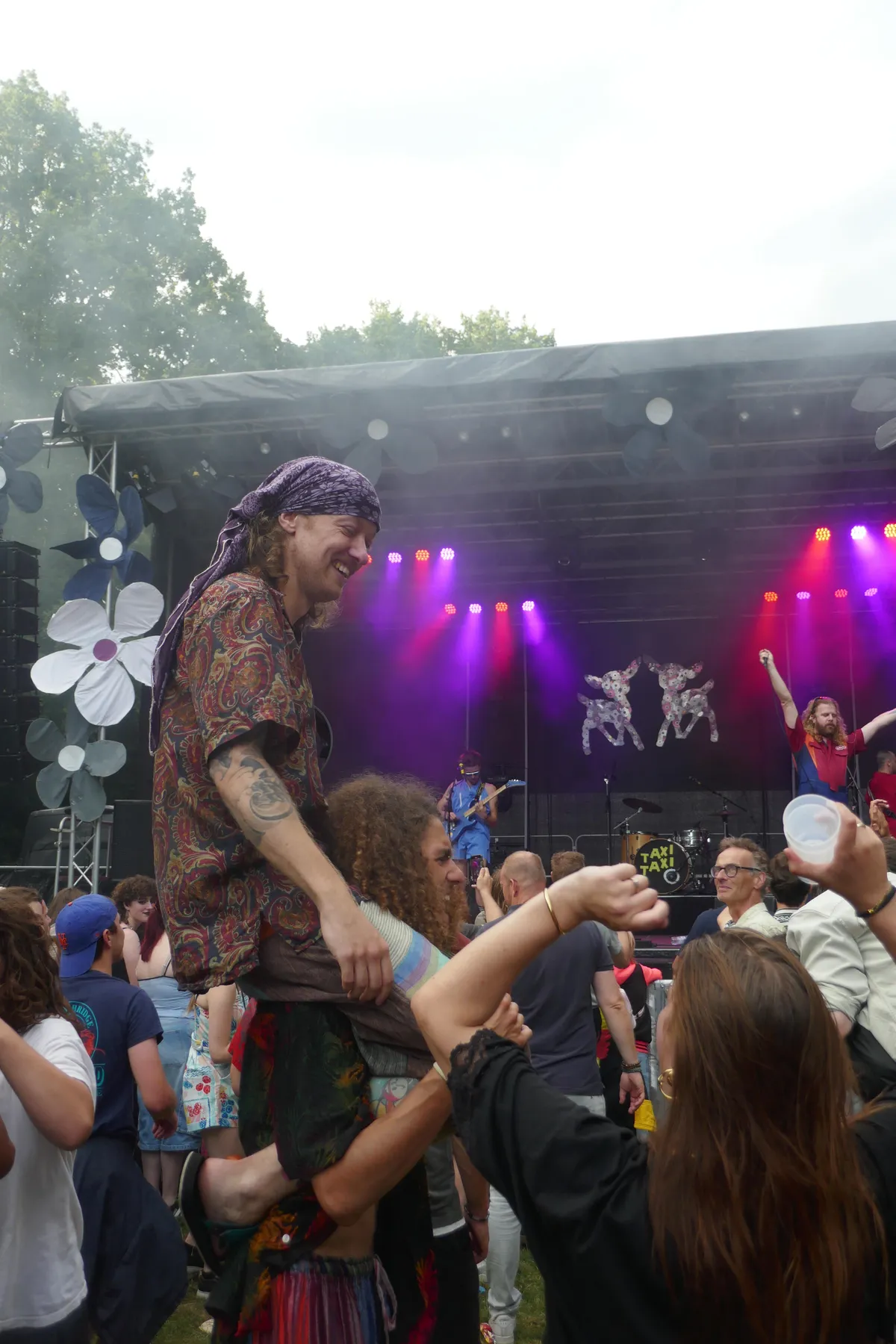 Een van de hoogtepunten van de set is het nummer ‘Vis’, waarin zij het publiek als een zwerm goudvissen gehoorzaam rondjes laten draaien in een denkbeeldige kom. Het publiek is enthousiast en doet gretig mee. Maar bij TAXITAXI is niets zonder dubbele bodem. En in dit zorgvuldig gechoreografeerde aquarium lachen zij zelf waarschijnlijk het hardst.