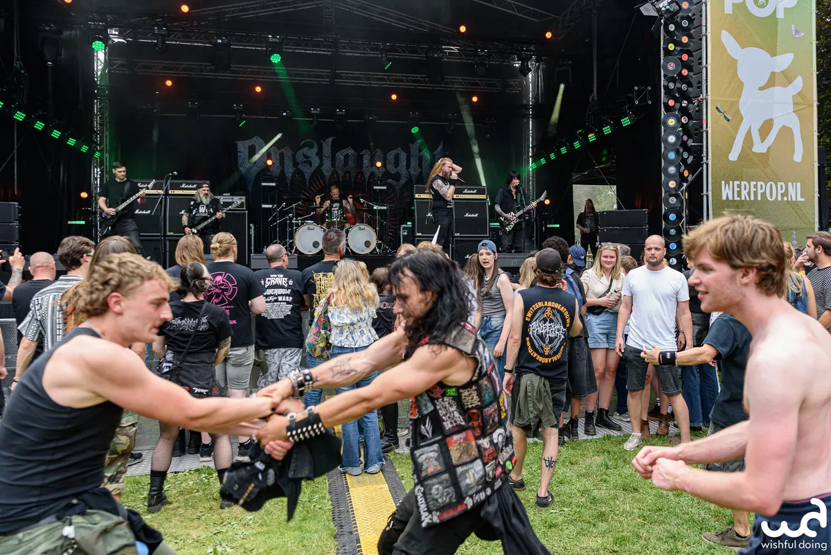 Iedereen komt samen in de Leidse Hout voor dit familiefestival: kippenpakdragers, motormuizen, sportschooljongens, dames in avondjurk, stoners, refo-meisjes, metalheads, jarige eenhoorns, mannen die nog met Lemmy gepit hebben en kinderen die nog niet geboren waren bij de vorige editie van Werfpop. Zij, jij en wij allemaal zijn welkom bij de Werfpopavond, het feestdeel dat begint met Paceshifters. Grote complimenten mogen vandaag naar de geluidsmensen: overal is de balans van het geluid goed. Daarnaast zorgen ze ervoor dat je op P1 P2 niet hoort, en omgekeerd ook niet. Ook de vriendelijke vrijwilligers en de logistiek zijn weer top. Waar eerdere edities wachtrijen kenden voor de bars of toiletbezoek kun je nu bijna meteen door. Een verbeterpunt: we ontdekten maar één waterpunt, naast de toiletten, en er stond niet of dit drinkwater was. Het gevolg was een Sovjetrij van dorstigen, en de Werfpop van de fistbump. Let’s party!