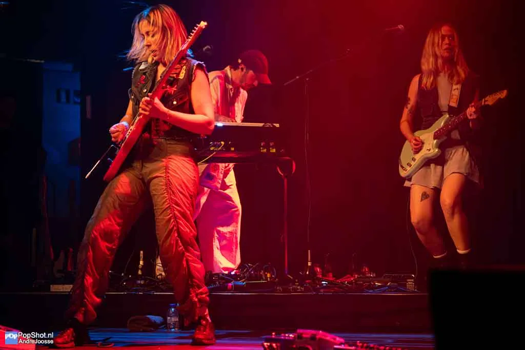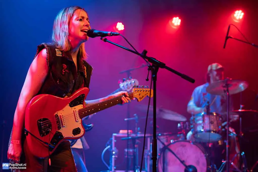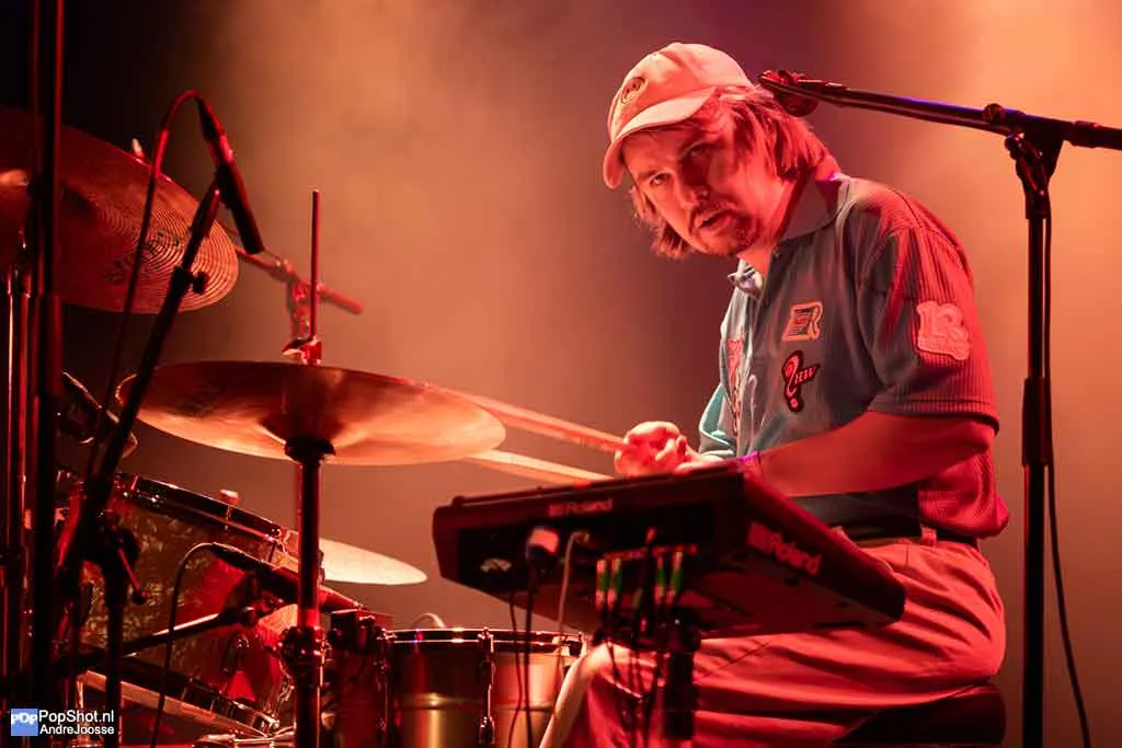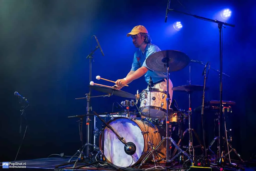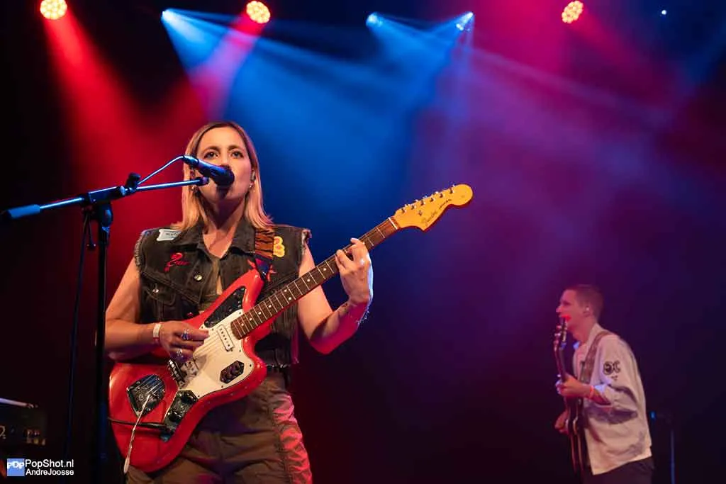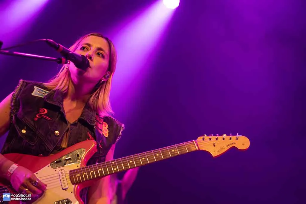 Een avond in Gebouw-T zonder voorprogramma voelt een beetje als een festivalweide waar je direct na binnenkomst bij de hoofdact staat. Geen opwarmertje, geen praatje, gewoon meteen bam: High Hi. De Vlaamse indiepopband begon ooit als trio, maar is tegenwoordig met vijf man sterk. Naast de vertrouwde kern staan er nu een toetsenist en een tweede gitariste op het podium. Die laatste is een gouden zet: haar harmonieën mengen vlekkeloos met de stem van frontvrouw Anne-Sophie, waardoor elk refrein nét wat meer glanst.