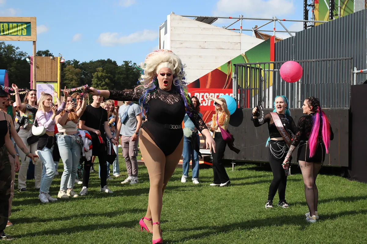 Dat gaat ten koste van enig karakter dat dit festival zou kunnen hebben. De Drafbaan is een unieke locatie. Het terrein wordt omringd door bomen, maar daarachter zie je hoge gebouwen als de apenrots oprijzen. Dat merk je door de felle kleuren, merknamen en grote drukte nauwelijks. In plaats daarvan is het een kakofonie aan geluid en lange rijen, vooral bij het eten. En dat terwijl 4PM Entertainment juist dat laatste had willen voorkomen: “We vinden het echt belangrijk om het serviceniveau echt te verbeteren ook ten opzichte van vorig jaar, (toen er door fouten McDonalds moest worden uitgedeeld om de brut nog van eten te voorzien, red.) of het nou gaat om toiletten, eten halen of drinken halen,” zegt Mitchel.