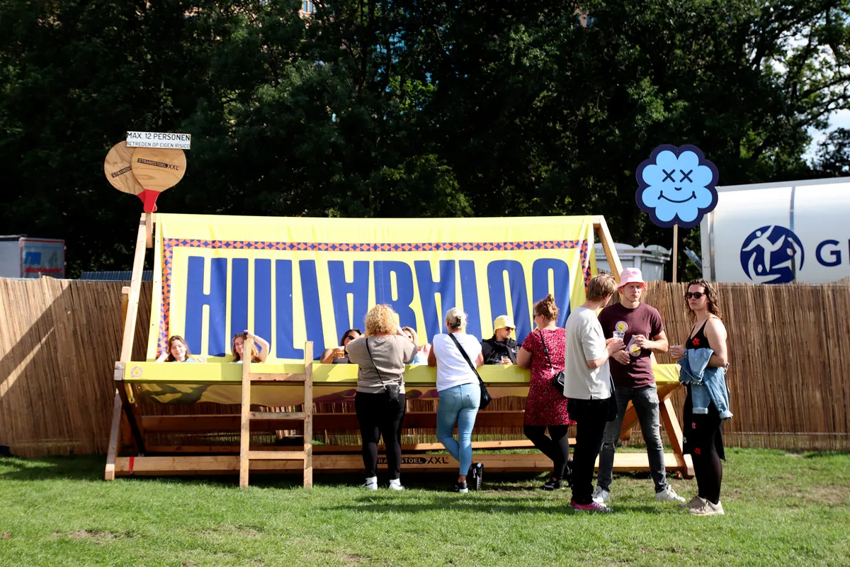 Het terrein van Hullabaloo is mooi opgemaakt. Alles in dezelfde huisstijl als op de socials, compleet met vrolijke kleurtjes en bloemetjes met gezichtjes erop. Overal waar je kijkt is er wel iets te doen, of het nou live muziek, karaoke, theater, eten of drinken is. De enige plek waar je - soort van - kunt ontprikkelen is op de picknickbankjes bij de foodtrucks. Een fijne plek om even te zitten, in de schaduw en met genoeg vuilniszakken voor je afval. Je zit alleen wel midden in het geluid van minstens drie verschillende podia.