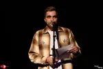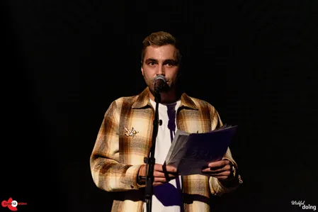 Michael Koevoet mag de middag openen - hij presenteert de acts, maar treedt ook niet onverdienstelijk op als dichter. Speciaal voor deze middag heeft hij een nieuw gedicht geschreven, 'Willem Weerstand': vijf A4'tjes lang, per ongeluk tweezijdig afgedrukt. Om niet in de war te raken, werpt hij zijn voorgelezen bladeren zwierig op de grond.