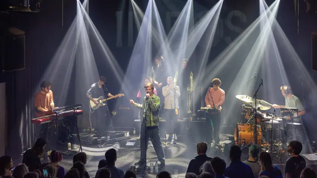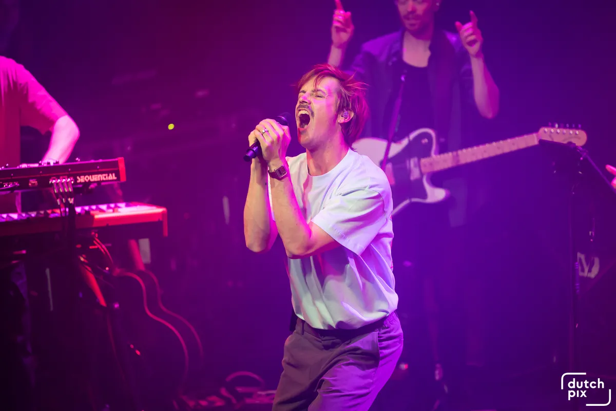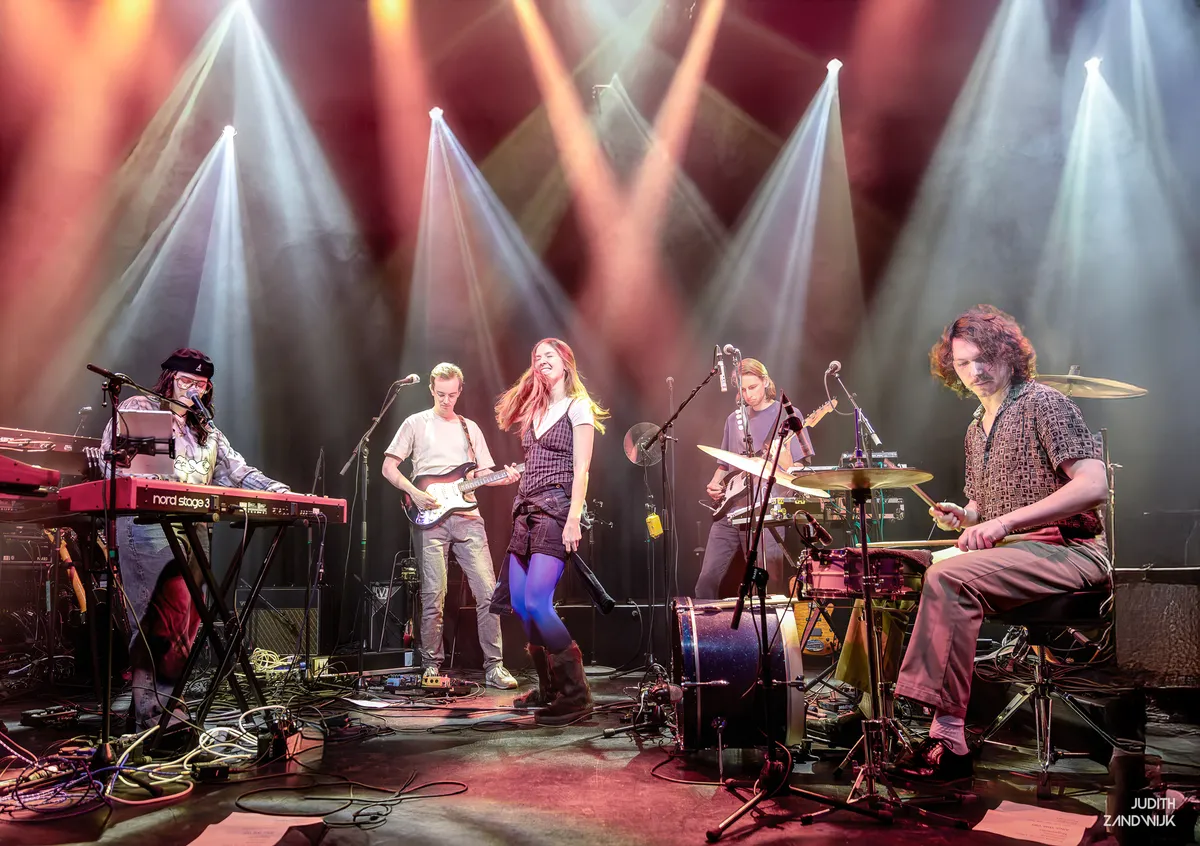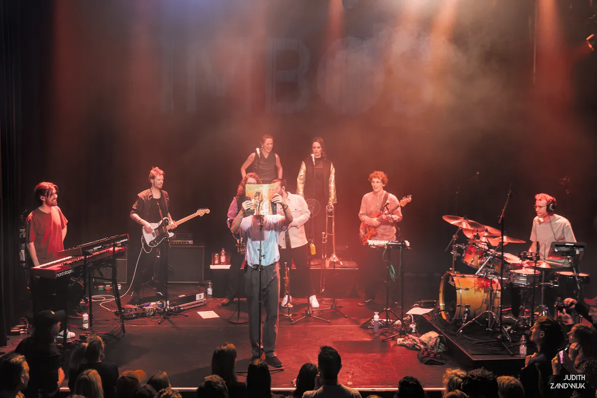 De band komt op. Met twee achtergrondzangeressen, twee blazers en een volledige band heeft IMBOS alles uit de kast getrokken. Door de zaal klinkt het ruisen van de zee, een mooie overgang na Anne Vera’s ‘Oceaan.’ Dan zet de band het eerste nummer van het album in: ‘s Nachts in mijn dromen,’ een energiek liefdeslied met een Doe Maar-esque beat. De blazers gaan los en de achtergrondzangeressen dansen enthousiast mee. De band speelt strak en het publiek smult van deze geoliede machine. De toon van de avond is gezet.