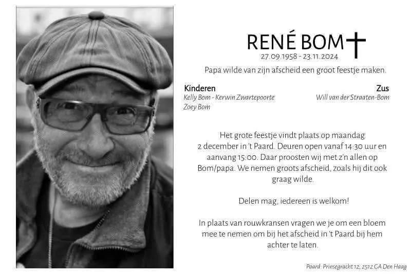 Wie afscheid wil nemen van René, kan 2 december om 15.00 uur terecht in PAARD. “Papa wilde van zijn afscheid een groot feestje maken”, aldus de dochters van Bom. “We nemen groots afscheid, zoals hij dit ook graag wilde.”