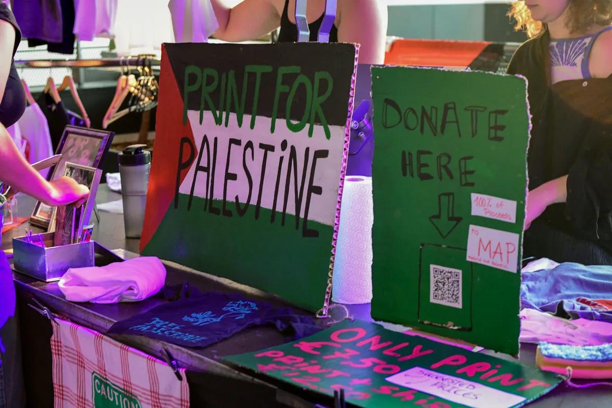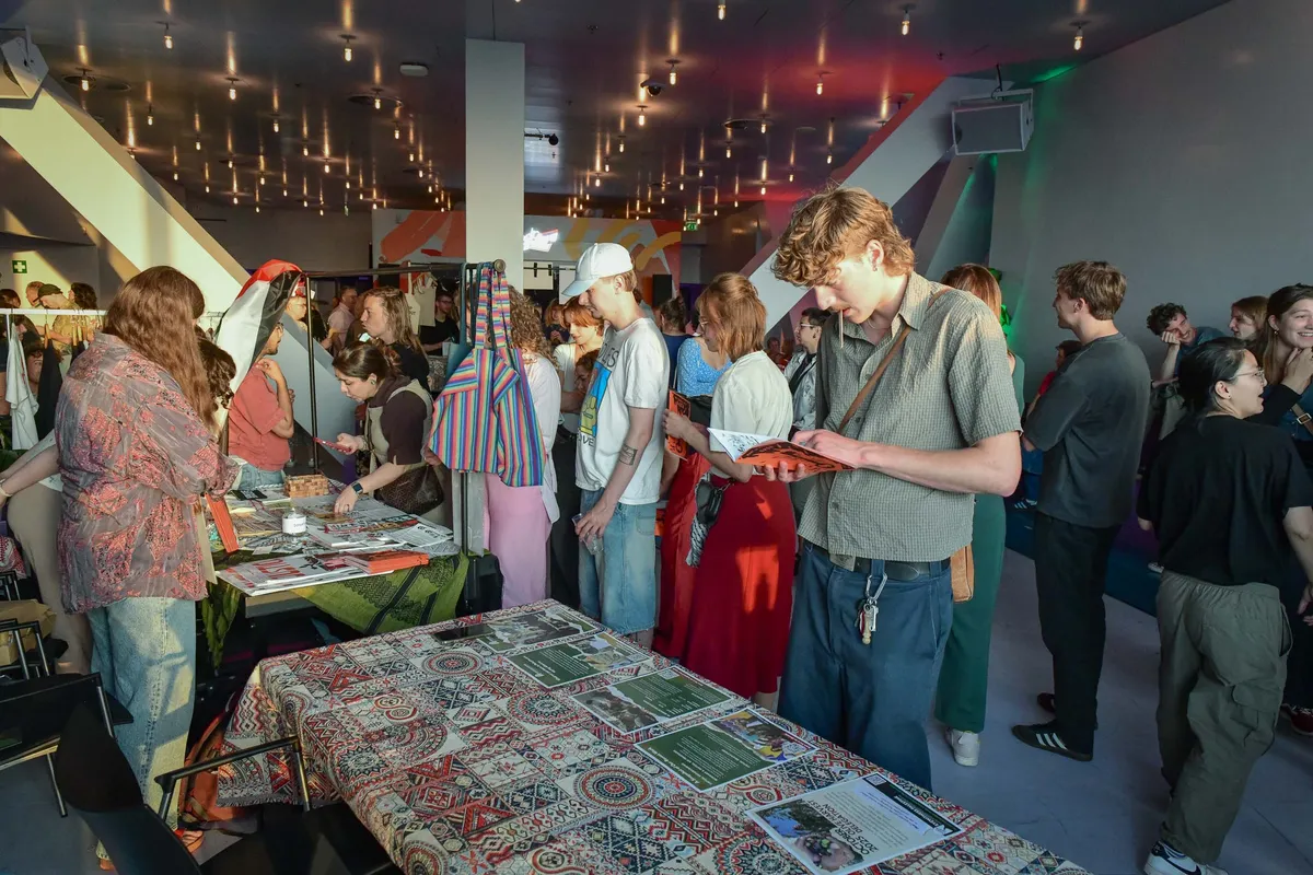 Bezoekers die woensdag vanaf een uur of zes de zesde verdieping in TivoliVredenburg betreden, zien dat die voor een groot deel een Palestijns thema heeft. Bij een eetkraampje zijn traditioneel Palestijnse wraps te krijgen, er is kleding te koop met de tekst Don’t stop talking about Palestine en iets verderop zijn onder andere tekeningen van jonge Palestijnen te zien, afkomstig uit een tentoonstelling in Moira. Er kan gedoneerd worden en de inkomsten van de avond gaan grotendeels naar Oxfam Novib, dat het zal gebruiken om ter plekke de broodnodige hulp te verlenen.