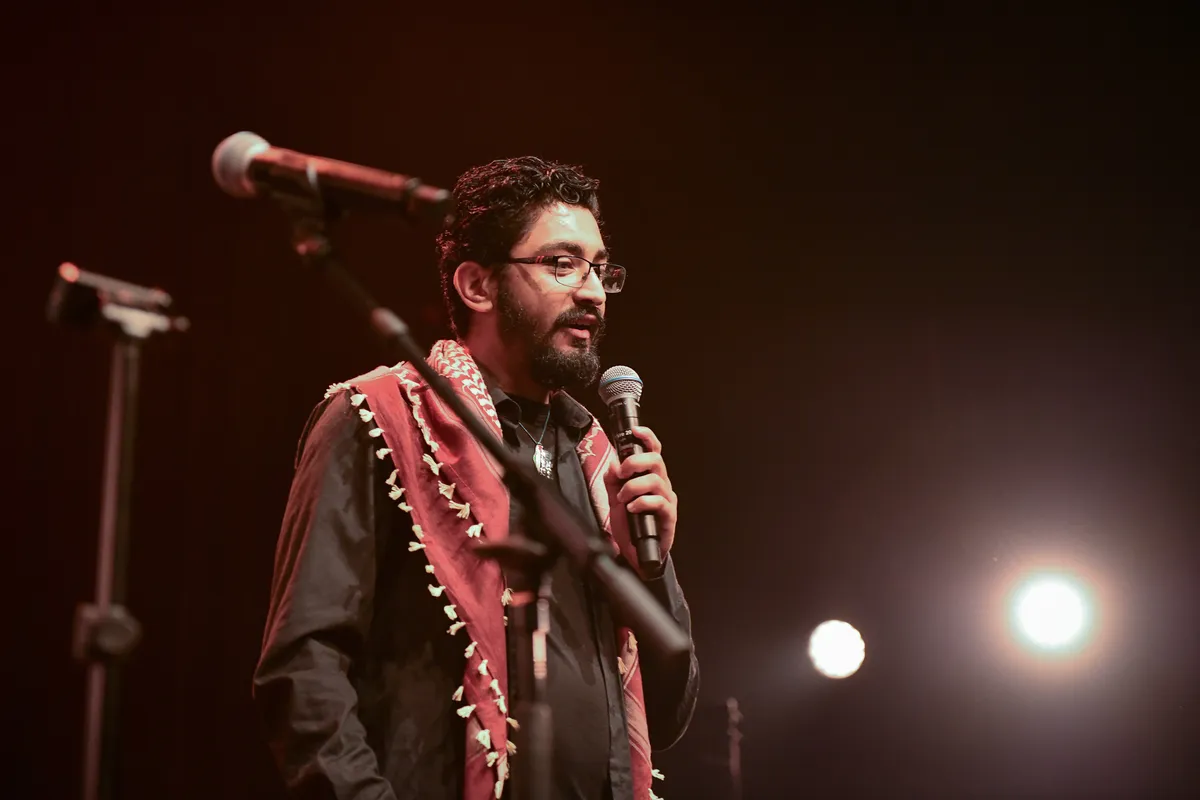 In zaal Pandora komt het publiek vanaf zeven uur in de stemming met protestzanger Gharib Ali, afkomstig uit Syrië, het land dat hij moest ontvluchten vanwege felle kritiek op het regime van de toenmalige president Assad. Na introductie van gastvrouw en journalist Maya-Nora Saaid is het woord aan Nouraldin Alsweirki, een Palestijnse softwareontwikkelaar die ontslagen werd door zijn Nederlandse werkgever na het plaatsen van berichten op LinkedIn waarin hij zijn steun voor Palestina uitsprak.