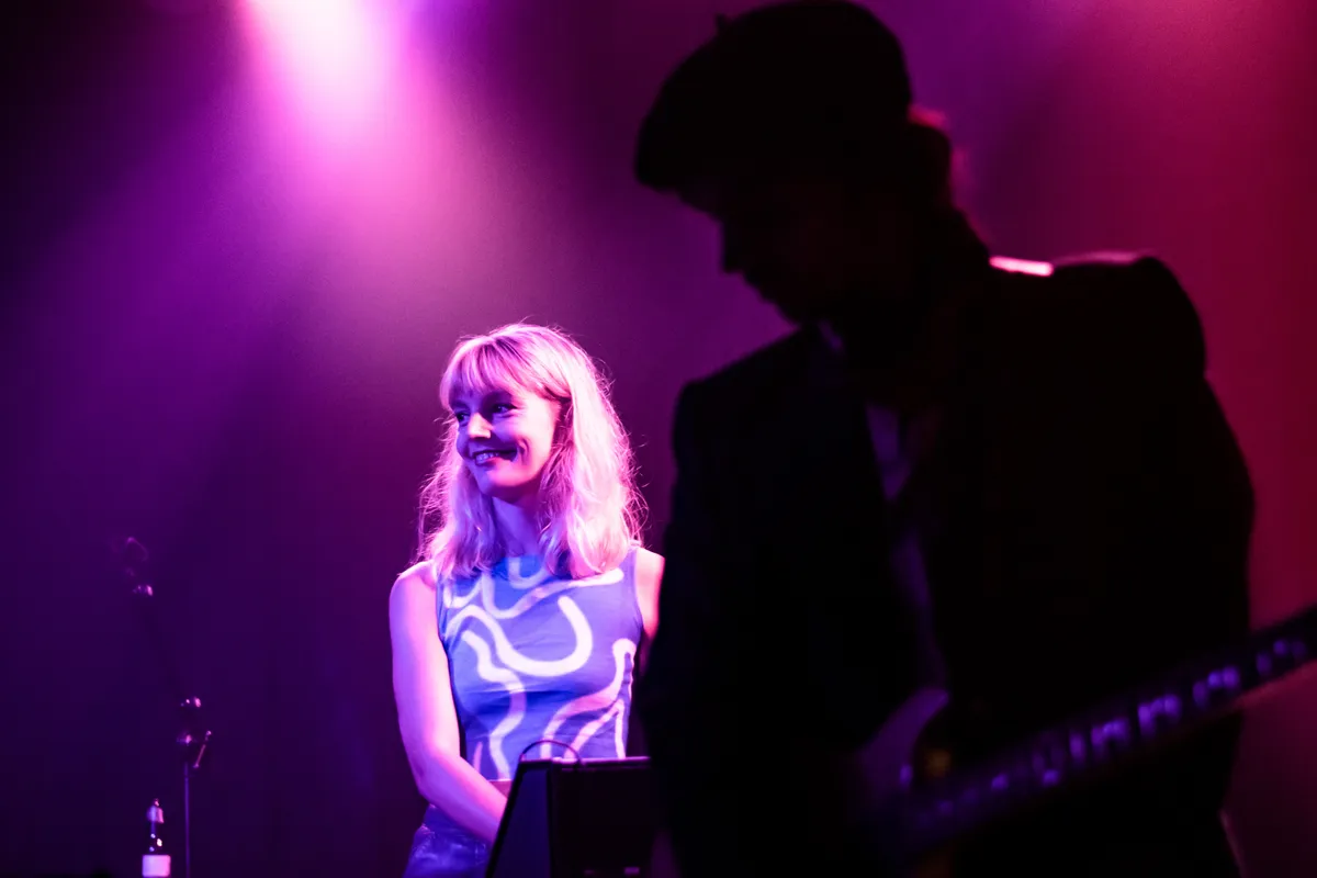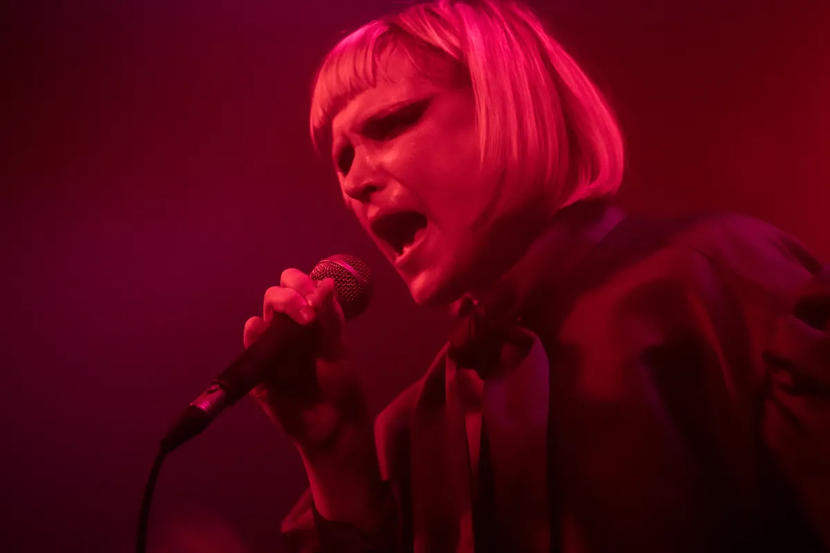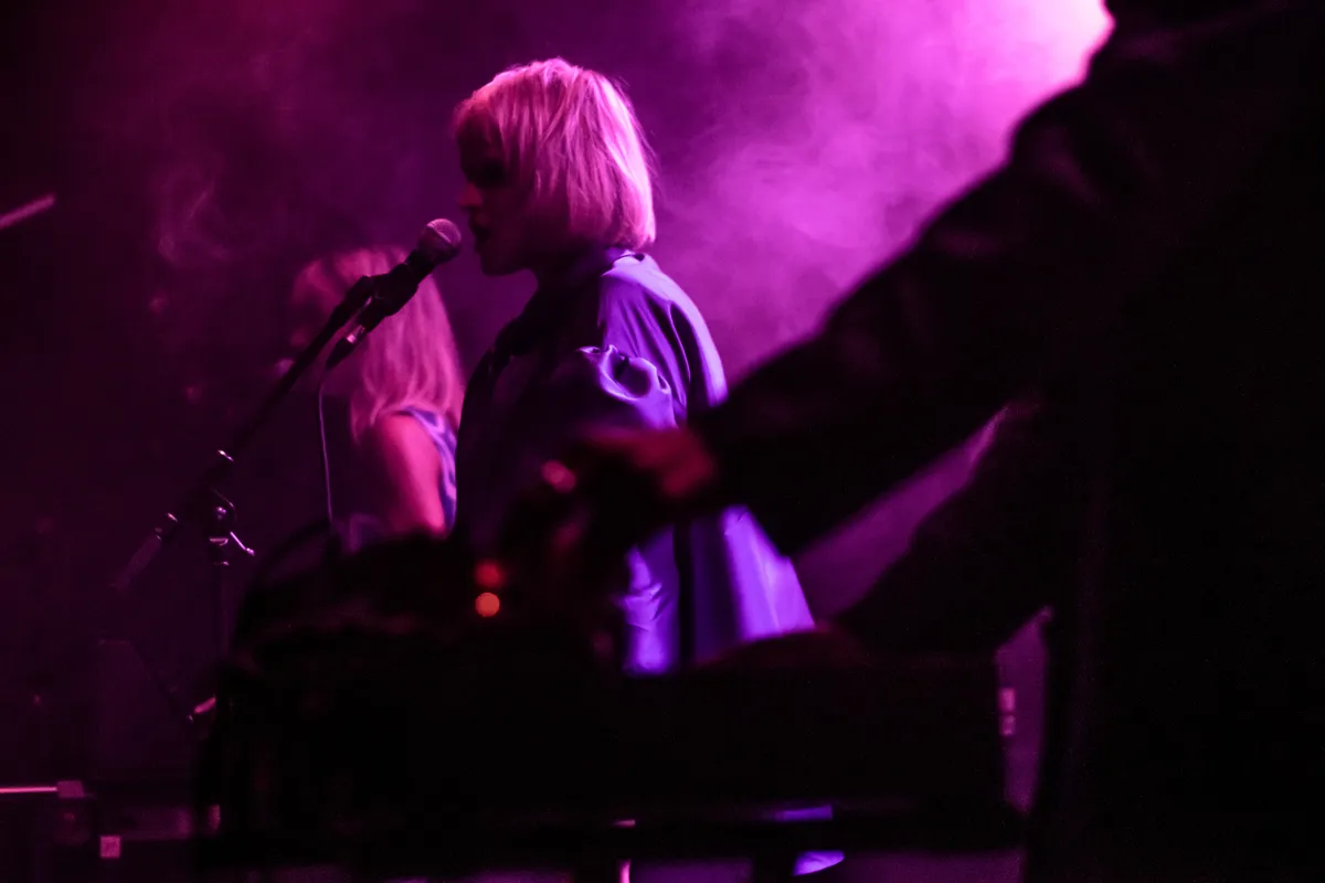 Enkel blauw en rood licht, de frontvrouw in het midden. Hoge laarzen van lak met hakken, een panty en daarboven een glanzend blauwe blouse die als korte jurk dient. Blond, kort bob-haar en lange zwarte spitse halen in de make up op haar ogen. Ze staat in het midden tussen haar twee synth-bewerkers en er is maar net genoeg ruimte. Bij volgende nummers wordt zo nu en dan een basgitaar toegevoegd, en de stem krijgt ook steeds meer plek in de set. Robotische effecten op de pompende beats. Een nederlandstalig zinnetje wisselt een engelstalige af, alsof ze proberen een overbrugging te maken tussen ons en ‘de ander’. Een volle set van veel nummers met als hoogtepunt het laatste nummer voor de toegift, wanneer de discobal aan gaat. Ze maken het ons zwaar, zo tijdens deze laatste loodjes voor de versoepelingen van de corona regels. Dit leent zich om te dansen, dus geef ons nog twee uurtjes en laat ons dan gaan.