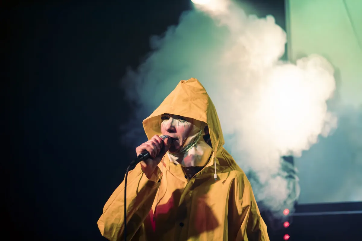 Het blijft even stil, tot een stem klinkt: ‘What are the life lessons of an egg?’ Even later verschijnt er daadwerkelijk een ei op het podium. Het kijkt wat verloren de zaal in. Maar al gauw verandert dit: het ei-personage werpt haar schaal van zich af en het nummer Runny volgt.
