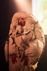 Het publiek past met gemak in een eierdoosje, de zaal is aan het begin van de avond nog dunbevolkt. Wie er wél is, kijkt verwachtingsvol naar het podium, waar al delen van een kostuum klaarliggen. Wat staat ons in vredesnaam te wachten?