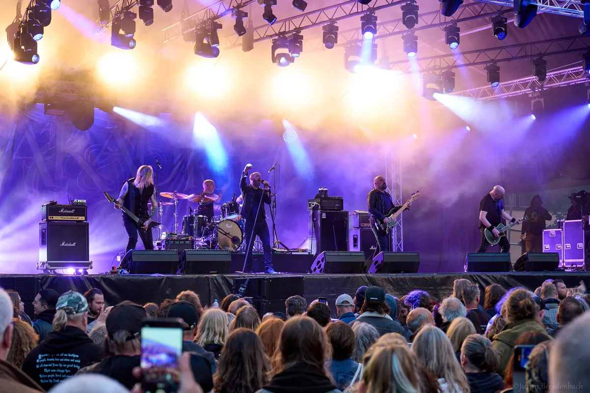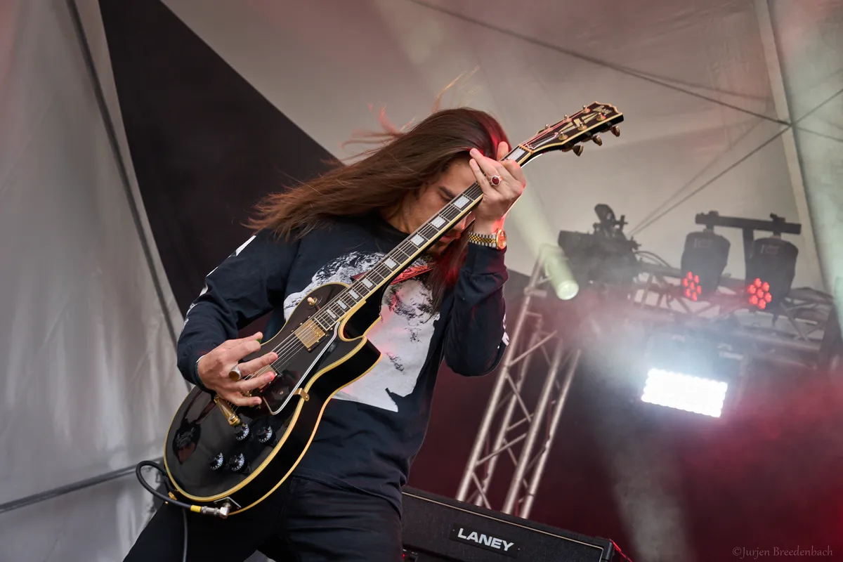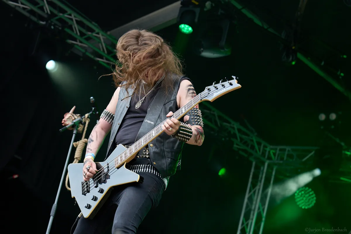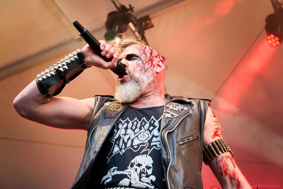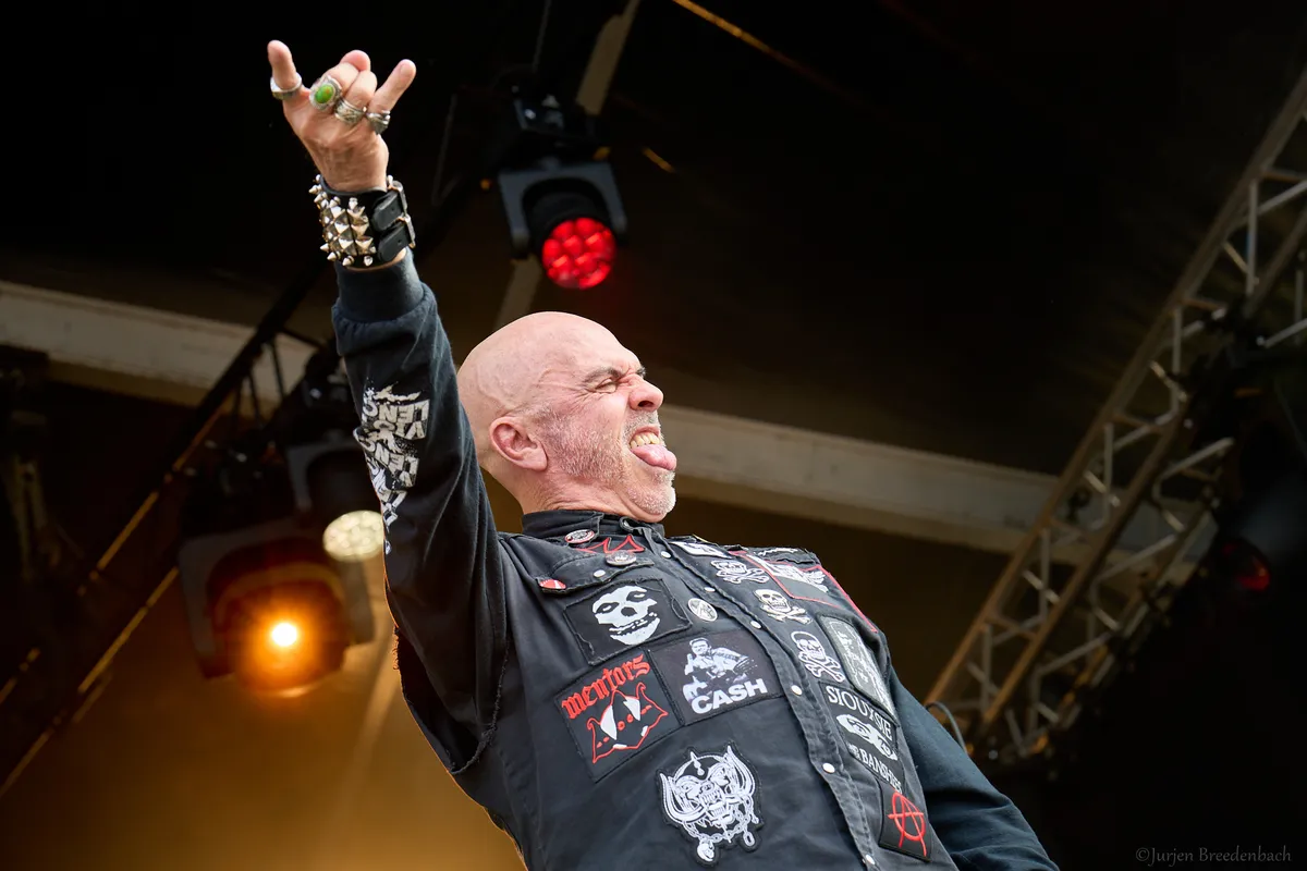 Het uit Los Angeles afkomstige Vio-lence heeft de volumeknop gevonden want de show is aanzienlijk veel luider dan de eerste act Arion. Wat direct opvalt is de bijzondere set-up van de drums, met maar liefst twee bass drums waar drummer Perry Strickland zijn handen de vernieling in slaat. De energie die van het podium afstuift laat het publiek eerst wat versuft achter. Het debuutalbum van de band kwam uit in 1988, dus ze gaan al even mee. Met hier en daar een hiatus is de band sinds 2019 weer samen en kwam hun plaat Let The World Burn uit. Vio-lence doet de naam eer aan, ze zetten vandaag een energieke en agressieve thrashshow neer waarbij er in het milde publiek zelfs een voorzichtige circle pit ontstaat tijdens het nummer Bodies on Bodies. Zanger Sean Killian weet de sociaal/politieke teksten nog altijd met passie over te brengen en laat een enthousiast publiek achter. (Sannette de Groes)